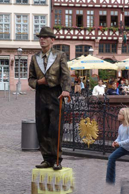 法兰克福老剧院 我这次奥德之行最后就是在法兰克福登机,在维也纳转机后返回北京的。奥德之行在法兰克福画上句号也还真算是有特殊的意义。 在法兰克福机场长达2个半小时的办理登机手续的过程中,让我亲身体会到了德国人严谨的作风。我们随行的一个人在黑森林买了一个布古鸟钟,把铜制的钟锤打在了旅行箱里,过安检的时候被误以为是炸弹,着实把德国人给吓坏了,要求把旅行箱打开逐一检查,最后搞清楚后才肯放行;更让人不能理解的是,导游的旅游鞋因为钉了两个后掌,也被要求脱下了又检查了一次。 德国人的一丝不苟,使我们飞机的起飞时间整整延误了半个小时。 不过,做为现在欧洲的金融首都,法兰克福所展示给世人的经济活力还是很令德国人自豪的。二战时它几成灰烬,损毁了95;现在变成了一个金融和运输的大都市。其传统的商业爱好给它决定了道路;其传统的贸易记录了它走过的道路;其越来越多的摩天大楼成了一个繁荣昌盛的德国的象征和保证。 公元794年法兰克福(旧称法兰克诺沃德)作为查理曼大帝的行都首次载入史册,公元855年首次成为皇室选举的舞台。从855年至1792年在这里至少选出过36位国王和10位德国皇帝,从中世纪盛期法兰克福就已经成为欧洲列国中重要的贸易和国际研讨会举行城市。 这座全名为美茵河畔法兰克福的城市还以它的自由思想、国际化以及对体育的狂热而著称。有超过14万体育爱好者在470家体育俱乐部注册。在足球方面则有三支德国甲级联赛的足球俱乐部——安德烈·法兰克福俱乐部、法兰克福第一女子足球俱乐部和FSV法兰克福俱乐部。 法兰克福还因承办1990年至1995年的世界网球大师杯赛(ATP世界男子职业网球冠军总决赛)以及1992年和1994年的联合会杯国际网球锦标赛而获得殊荣。每年一度的主要赛事还有著名的“Rund um den Henninger Turm”,一个世界马术跳跃赛赛事以及ETA法兰克福马拉松赛。 法兰克福的建筑 街头行为艺术 罗马广场 欧洲金融首都--法兰克福街景 |