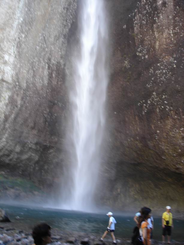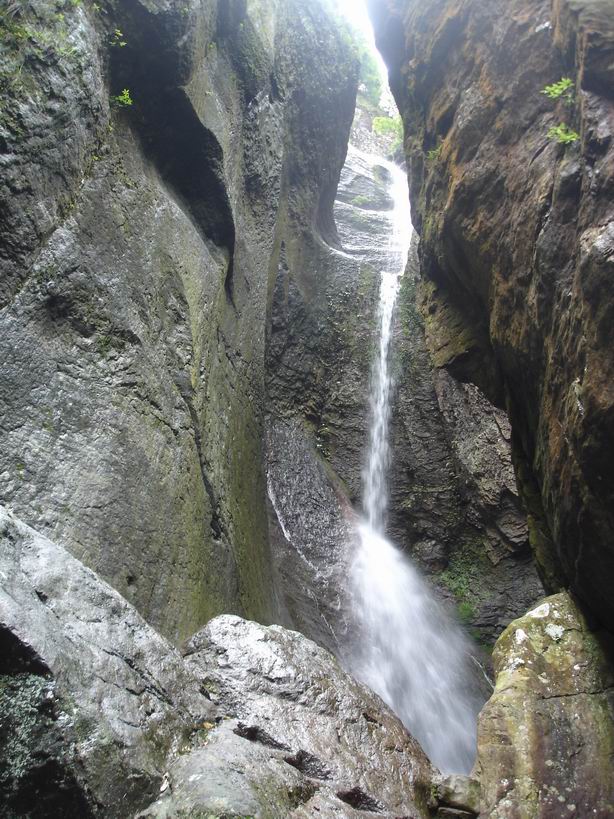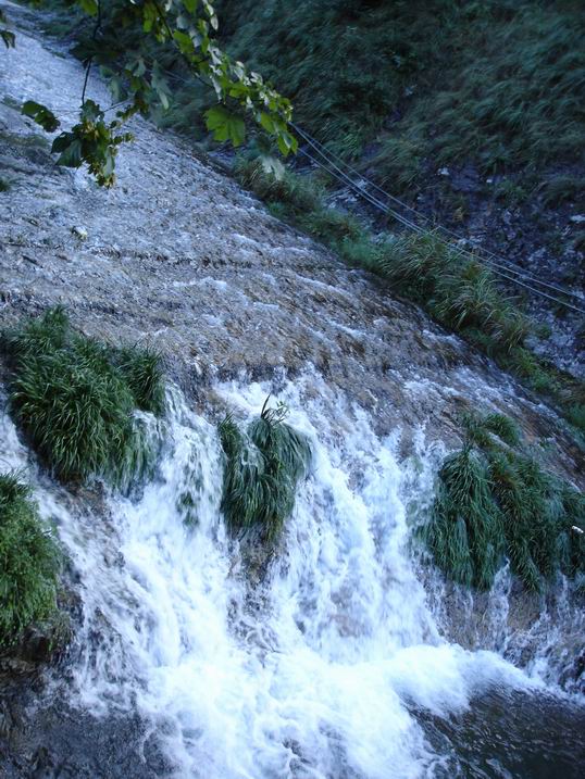 水是雁荡山的精灵,一路陪伴着我们,处处欢歌处处滋润我们的身心。出发前友介绍到雁荡山已枯竭干涸,想一想水灵灵的青菜萝卜成干瘪开裂的蔫蔫果,就知道那里的风景怎样了,嬉笑着回查过天气预报了,是暴雨、暴雨转大暴雨,我们就是带着及时雨去慰问的,实在不行,知道女人是水做的吧,多愁善感着,泪珠连连,还怕它不滋润? 灵峰的夜景可是说是独一无二的,白天的奇峰怪石,在幽幽夜色里惟妙惟肖地演绎成一幅幅线条鲜明的泼墨画,变幻成一张张意境犹远的美丽剪影,清醒的空气、寂静的山林,漫步其间莫不迷醉。可惜了没多久各路旅游团队的熙熙攘攘加入,吵醒了山谷,打乱了意境,此起彼伏的大声喧哗已如菜市场般喧闹,一声高过一声的导游介绍吆喝,刺痛了着耳膜,避之不及。山里的雨别有个性,来得猛去得疾,一阵瓢泼,打湿了衣裙,漆黑一片中深一脚浅一脚,只管跟着导游的灯光转悠,哪顾得了那脚下一片片水洼,不时踩进水塘里溅起一地泥水。摩肩接踵着一把把雨伞紧密相连,伞面上水珠连成一条线,只往你脖子里钻,和你亲密相拥。 一路溪水潺潺,清凉了空气,愉悦了心灵,唤回儿了时的淘气,时不时停下脚步,撩起水花打起水仗,踉踉跄跄着涉足探险。 “龙湫山高势绝天,一线瀑走兜罗棉。五丈以上尚是水,十丈以下全是烟,况复百丈至千丈,水云烟雾难分焉。”一路走来已挥汗如雨,未靠近瀑布处,已传来轰鸣一片,山谷里凉风阵阵,此时犹如救命稻草,经不住深呼吸,赶紧跨进这清凉世界,享受一番。穿梭在如烟如雾的水汽里,感受肌肤与水的亲密接触,满头满脸的水珠,衣衫逐渐变了颜色,却是流连忘返欢声笑语,个个淋成落汤鸡还乐此不疲。