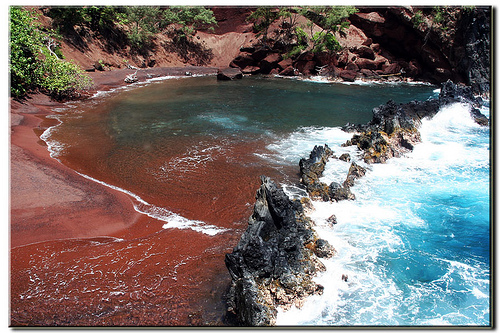 在West Maui游览了一天之后,第二天我的目标是号称天堂高速的Hana Highway. 说是高速,其实道路崎岖蜿蜒,不可能开很高的速度.单程就号称有400多急弯, 而且是未完成的环线,意味着来回得800多个弯道,以及几十座只能供一辆车通过的小桥. 如此艰苦的行程,为什么却吸引了这么多的游客呢? 带着同样的疑问我驱车上路了. 既然有Mini Red Beach, 必然是和真正的Red Beach相对应. 因为隐藏的很深,而且不对外开放, 所以当我询问两个工作人员时,她们严格根据规定没有告诉外来游客. 可是就在转身之际,一个墨西哥大婶神秘地指了一个方向. 我心领神会往崖边走去.不出5分钟,便到了这半月形的红沙滩.