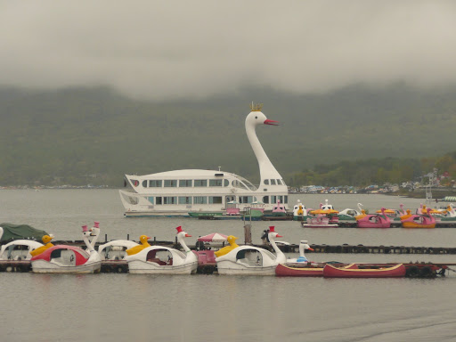 5月15日 富士五湖是指在富士山北面分布的本栖湖、精进湖、西湖、河口湖和山中湖。没有写错别字哦,真的叫西湖,呵呵。先看看我在博物馆拍的模型照片吧。右下角方向是北面,最远的那个是本栖湖,精进湖太小了,可能看不到吧,依次排序,最左边这个就是山中湖了。 据说本栖湖的湖水很漂亮,在湖面上的那艘黄颜色的船的船底一部分是玻璃的,可以直接看到脚下的水面呢。可惜因下雨停开了。 精进湖太小了没什么看头就没去,西湖的边上又找不到停车场,只好在移动的车上慢慢欣赏。西湖很狭长,风景看起来也不错,可惜没拍到照片。上次讲过我们就住在河口湖边上的,可能是因为天气不好吧,没觉得特别漂亮。还有奇怪的人整个下半身泡在水里钓鱼,天啊,那天那么冷,不知道他怎么想的?在船上钓不到么? 湖边上鸭子的羽毛还挺鲜艳的,呵呵。 超喜欢山中湖的这艘大天鹅船,好像是来迎接公主的样子,可惜我不是,哈哈。 我们坐的是这个小号的天鹅船,没有马达,人力蹬的,最多载三个人,30分钟两千日元。上面的蓝色海豚好可爱啊。 水上摩托很拉风啊,不过我觉得有点危险。 为了弥补没看到富士山的遗憾,新桑他们带我们去了富士山雷达半圆形屋顶馆。这可是在富士山最高点作为“监测台风的要塞”活跃了35年的啊。1999年完成它的使命之后被整体搬移到富士山脚下“富士吉田市”里作为体验和学习的设施继续发挥着作用。管内不仅公开了雷达半圆形馆的内部,还展示实际使用过的设备,及几个体验角。在那里可以体验富士山顶的气温零下5度、风速13米的非常恶劣的环境以及使用曾在山顶实际使用过的观测设备进行模拟台风观测等。可惜馆内不允许拍照。 馆内一楼还有个免费的纸画展,和国内的剪纸不是一个概念,没有洞洞的,呵呵,还有点立体的感觉。 雷达馆和富士吉田市历史民俗博物馆紧挨着,共通门票为600日元。日本这些文化设施的门票相对来说还是比较便宜的。其实没什么好看的,听名字就知道了,但既然是通票,就去看看了。 旧武藤家住宅,典型的日式农家建筑,在博物馆外面也没有人看管。乞丐晚上在这里住宿都可以,呵呵。 里面的东东都很有历史的样子,和我们同去的一位日本同事说他小的时候就住在这样的房子里呢。