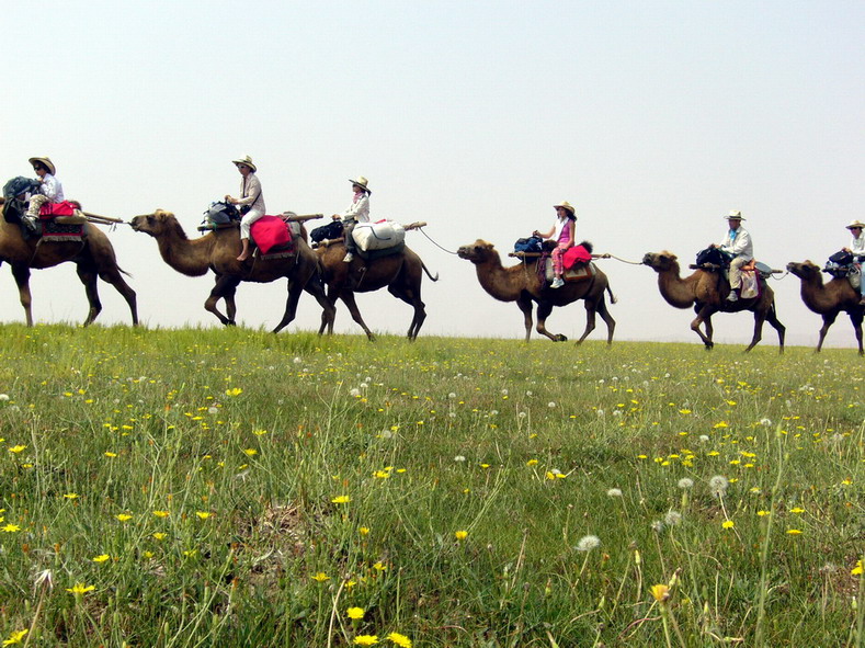8月10晚上抵达“沙都”中卫, 出发前朋友介绍了一个当地户外俱乐部的领队王天华13723354989,准时到火车站接我们,住在他给我们预定的宾馆120元/天。 第2天8:00出发,到沙坡头。中卫:宁夏与甘肃、内蒙的交界处,西来的黄河在此转往北方,也称黄河第一弯。黄河两岸,一边是青山隐隐的塞上江南,一边是遍野的漫漫黄沙,即我国四大沙漠之一的腾格里沙漠,以移动性沙丘为特点,年降水量180毫米,年蒸发量2500毫米。包兰铁路从沙漠中穿过,用“麦草方格”治沙,铁路两边已都成绿地。沙坡头景区由一条公路和包兰铁路穿过而分南北两部分,南区为黄河景观。 说实话沙坡头是值得一去的,这里集大漠、黄河、高山、绿洲为一体。就是门票太贵65元,不过王先生帮我们买到了50元的旅行社门票。里面各个都是收费项目,空中速降60元,羊皮筏80元……。精彩的是在沙坡头的邻居腾格里沙漠。有王天华先生带我们骑骆驼进入沙漠,租骆驼费用为240元/人。越往深处沙丘越高,无人划过痕迹只有些如水波般的沙纹,接天处那弧线是天工之神笔。如果愿意的话,可以骑骆驼走3天,包括向导费用,晚上住通湖。如果你想看沙漠日出的话建议你住在沙漠腹地围着篝火,看着满天的繁星,大口喝酒,大口吃肉。 8月12日 早上7:05乘班车到达银川24元。打的25元找到凯达大酒店,说是银川最好的酒店,也不过如此。下午参观当地的历史博物馆——承天寺,宁夏是回族自治区,参观的时候不由想起了《穆斯林的葬礼》。宁夏俗称小上海,东西是挺多的,不过比上海要贵。西北的夜来的很晚,下午6点仍是阳光明媚。到宁夏风味名小吃“万宝楼”吃涮火锅,没想到最后上来一大个暖锅,不用涮了,东西已经全在里面。