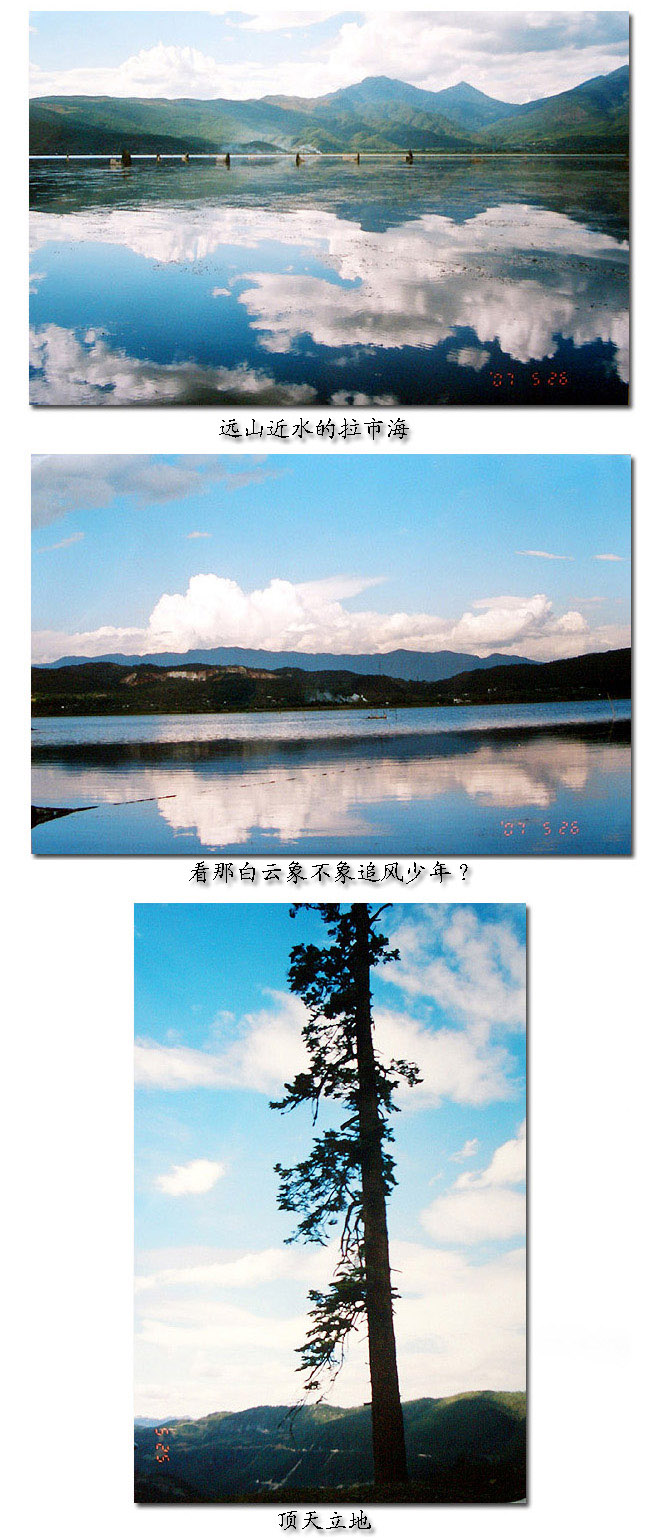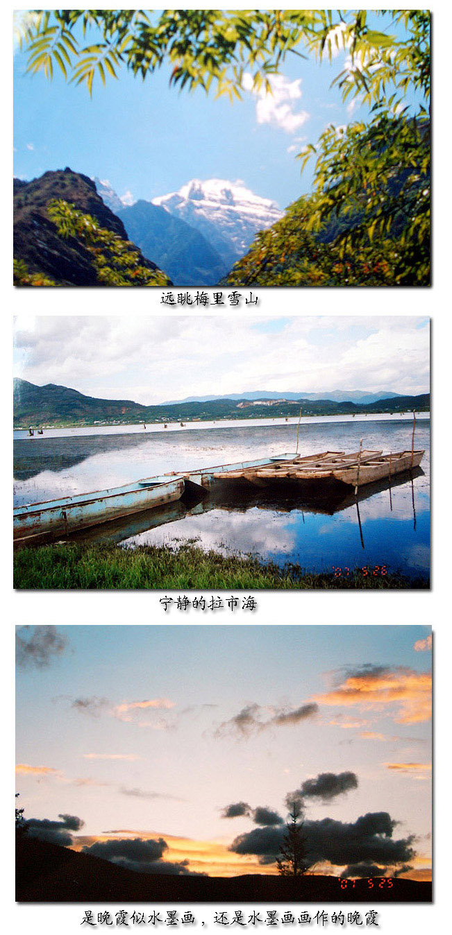 沿着木板小桥走到湿地边,抬眼一望,我不禁惊呼起来:这哪里是人间,分明是天堂啊!远山、近水、蓝天、白云,浅湾处泊着几只小木船,远处一位很酷很帅的藏族小伙子在等待我招呼他撑船。还用犹豫吗?一挥手,小伙子驾小舟来到面前。于是,一叶扁舟载着我(回族)、导游(纳西族)和船夫扎西(藏族)三个民族的三个人向湿地的深处划去。水,清澈见底,导游小妹妹脱去外衣将手伸到水深处,好不容易为我捉到一只活贝;扎西则用不太流利的汉话指给我看远处的睡女峰、马鞍山和水中美丽的倒影。我呢,完全象个花痴大姑,手舞足蹈、兴高采烈,不时诵出一两句“青山秀水、人生何求”之类的好词佳句,感染得姑娘、小伙和我一样忘情于山水间。此时,天地之间好象只有我们三人,我们三人也与这片天地融在了一起……拉市海,我的忘情之地,等到百鸟驾临之季,我想我还会回来看你!