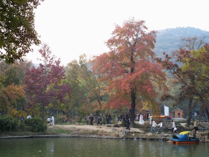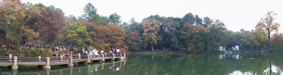 深秋时节,天晴气朗,闲着无聊,随处走走。 动车没票,只好将就,将近十点,才刚出发。 原本行程,仅一小时,将到苏州,临时停车。 一停就停,四十分钟,十一点半,才到苏州。 出苏州站,尘土飞扬,对面河道,正在开挖。 广场左侧,购回程票,排队人多,买得动车。 广场右侧,乘坐游四,将近一点,才会发车。 三十八路,可到木渎,马上开车,不用久等。 苏州公交,慢似蜗行,日暖车摇,秋乏昏昏。 木渎古镇,小桥流水,山塘老街,临水人家。 小店林立,游人如织,江南水乡,大同小异。 石家饭店,鲃肺汤鲜,酱方肥美,淘饭味嗲。 打的离去,天平山近,贵族学校,依山而建。 临近景区,车堵人多,下车步行,片刻即到。 红叶节故,门票十八,票上叶红,PS之功。 步入景区,枫未全红,范公祠前,菊花正黄。 登山而上,游人成堆,山石凌乱,登山不易。 鳌鱼石前,侧身让行,老翁步虚,将吾撞倒。 幸一阻滞,才得不倒,幸甚幸甚,阿弥陀佛。 可怜吾股,磕大石上,乌青一片,很是疼痛。 愈行愈上,视野渐朗,天平之顶,开阔明媚。 近观远眺,枫林间染,灵岩塔踞,城区清晰。 下山之路,乾隆御道,台阶平整,款行遐意。 池塘桥曲,观之眼熟,西游记中,有此一景。 此处风光,可谓独好,枫树环绕,色正当时。 天蓝水清,枫红叶黄,夕阳染金,瑰丽鲜妍。 流水潺潺,落叶随波,阻于溪石,涓涓微渎。 夕阳西下,恰当归时,三一五路,可达石路。 山塘夜景,灯火璀璨,游人稀疏,漫步恰怡。 藏书羊肉,汤鲜味美,小吃多多,无奈腹小。 临河酒吧,艺术馆多,各具特色,情调小资。 夜泛游船,徐徐而行,灯光辉映,夜色迷醉。 告别苏州,动车飞速,仅半小时,即已抵沪。 秋日一游,轻松悠闲,一觉天光,自然醒爽。