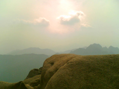 会议后主办方安排了游黄山和宏村。原本没寄希望于游览,当拿到旅游小册之后,开心得不得了,黄山奇秀,宏村集徽派建筑艺术经典,都是我非常向往之地。 两点从合肥出发,经过五个多小时的车程,天黑之后我们到了黄山下的太平。听地陪说黄山这几天在下雨,我和同事女孩去酒店附近的超市买了雨衣,我买了白色的布鞋,小时候经常穿的那种——准备登山用。 第二天早上五点半被morning call叫醒,仔细听听,外面铃声此起彼伏煞是热闹。早餐之后向黄山进发。透过车窗看到林间云雾缭绕,远远云山雾海,忍不住拿出相机啪啪拍起来,这连游览黄山序曲都算不上,想想为了节约电池还是停止了拍照。到了上山缆车的地方,走下车看到阳光透过薄雾洒下来,心情格外舒畅。 一大群人挤在缆车上,看缆车缓缓上升,黄山千岩万壑的景色也在我们面前一点一点展开,大家不时发出惊叹声。下了缆车一群人浩浩荡荡跟着地陪游各景区,一路上我不停地拍照,老板拿着相机后我便用手机拍,一棵松,一块石头皆可入画,一路走了哪些景区,导游介绍了哪些黄山典故,都没有什么印象了。 经过梦笔生花,转到始信峰。几级台阶尽头一堆巨石堆着,踩着巨石上去,原来下面就是悬崖千丈,不远处的山峰真的是“壁立如削”,岩石上还有松树生存。“始信峰”原来是游人走到这里“始信黄山天下奇”。 走到鳌鱼峰时,我和同事还有其他几个人已经是落在最后了,断后的地培导游耐心地等着我们。站在鳌鱼峰上,不宽的石路,一边是鳌鱼峰硕大的巨石立在那里,一边是深远的山谷以及延绵不绝的云山云海,远远看到山谷里一汪碧绿的池水。几个黄山挑山工扛着长长杉木吆喝着迎面走过来,真是“狭路相逢”,我们赶紧靠着石峰一面让过挑山工。走发财路从鳌鱼峰下来,经过一个石洞,出来看到石洞上刻着“天造”二字。地培导游说,这是个天然石洞,当年朱元璋被元兵追杀逃到这里,无路可走,正着急的时候发现有个山洞赶紧躲了进去,上到了鳌鱼峰躲过了元兵追杀,因此,朱元璋走过的这条路叫发财路。 百步云梯爬上去,最后几级石阶差点跨不上去,两条腿酸胀,感觉不属于自己身体的一部分了。撑着边上的石壁大口大口喘气,到了云梯顶上腿一软坐了下来,大家都在这里休息。这处景叫“龟蛇守云梯”,道路两旁各有一块巧石,一边的像一只巨大的龟,另一个据说是蛇,像龟的巨石的确很神似,那个蛇我倒没怎么看出来。 再往前的景区便是赫赫有名的黄山迎客松了。曾无数次看过迎客松图片,以为看到的景色也不过与多少次见过的画面一样不会再在心里引起惊叹,然而站在迎客松面前,看松树倚石壁而立,以千年不变的风姿在风霜雪雨中看过往来客,后面深谷幽远,山峰秀丽,还是忍不住感慨天地有大美。这里的石壁上到处都留下前人对黄山的赞美,最有印象的是“岱宗逊色”,说的真是霸气,泰山更多的是受古代帝王青睐,我想黄山是不懈跟他争官方人文吧。 我们是四点在慈光阁集合,这一天的时间只能说是走马观花看黄山。第二天起床,踩到地上差点摔倒,才发现两条腿酸痛。亏睡前还和同事吹:爬黄山刚觉得累就呼啦啦一群人一起休息,爬得一点都不过瘾。