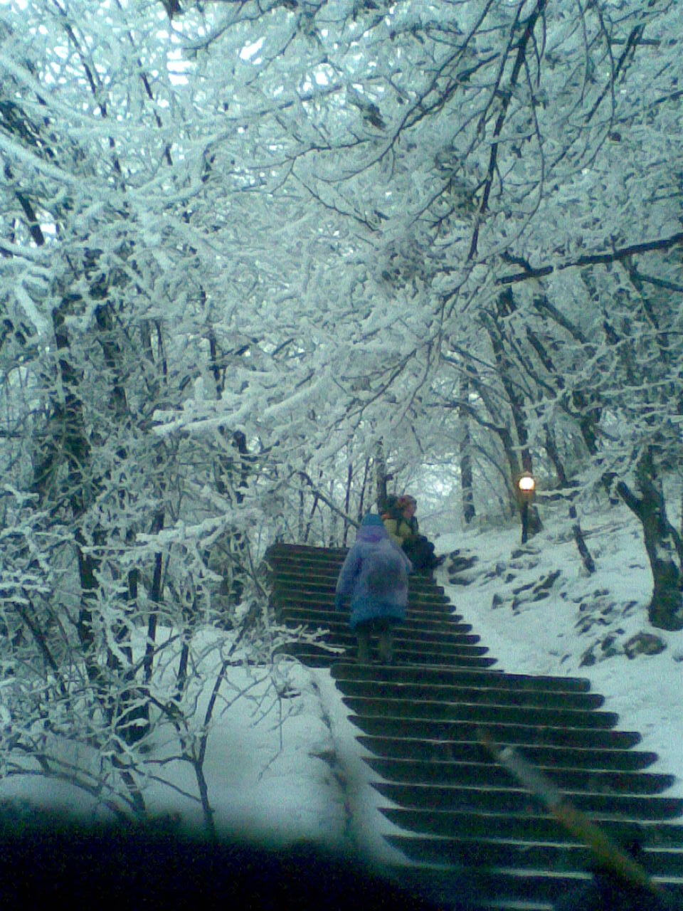 因为07年8月的底的一次黄山游让我对它的冬季雪景非常的向往。1月下旬全国大部分下雪,气温比往年偏低,去黄山看雪的大环境已经有了,于是密切注意着它的天气。下雪,综合各方面考虑,火车来回是最好的交通方式。在25日晚去黄山的火车上,发现与我有相同想法的不止我一人,碰到一个亦是独行的女生,于是相约同行。26日上午10点,火车准时的停靠黄山车站。乘上从屯溪到汤口的车后,由与前晚的大雪,交警开始拦路检查车辆的防滑链,而我乘的车恰巧没有,折腾了近2小时终于买了回来,被放行通过。车上又与2对同代的情侣结伴同行。于是6人商定住上山,网上得知云海楼和游豆腐客栈可以较低价格定山上的房间。于是通过了云海楼代订了山上排云楼的6人独卫房,80元/床。六人前仆后继好不容易做上新国线,乘上了缆车,到达山上,悬着的一颗心终于放了半颗;待晚上去排云楼开房的时候,另半颗也放了下来。这云海楼果然不是骗人的,想想他们在我们出发前急着催我们上山,还给我们免费讲解路线,觉得“网不虚传”,能设身处地的为游客考虑,在此表扬一下。排云楼的2106房打开了,房间比想象的要拥挤,走进推开卫生间,觉得还可以。在闻闻味道,没有霉味!大开心一下!上次住排云楼标间可是闻了一晚的霉味。此时,听到同伴又发现了取暖器和除湿器,顿时觉得这80元物超所值啊!游完前山,乘玉屏索道下山的途中,体验了惊魂一分钟。缆车半途中突然停驶,车厢有了明显的晃动,真是吓!下了新国线,发现汤口南门换乘点没一部车,据说屯溪停发了,还好找到旁边的一部黑车,心里窃喜!然而就在到屯溪时,车辆爆胎了!晃晃悠悠的开到了屯溪吃了饭,上了火车,本想终于可以到上海了。没想到遇到全国火车大晚点,晚了14个小时!由于黄山到上海的火车没餐厅,晚点这么长,大多数旅客食物和水不足,买又买不到,下又下不去,体验了一次“弹尽粮绝”!这次的冬游黄山,必定难忘!