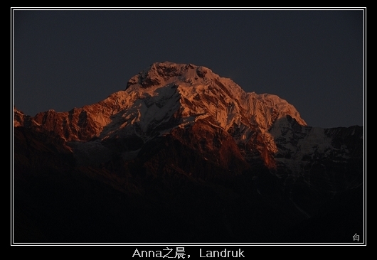 在“驴”的世界里,大家都知道有个地方是天堂,叫做尼泊尔。元旦后我只身前往,的确没让我失望,现将其中精华段就是ABC和POONHILL的单人徒步过程与大家分享。(再次感谢00同志辛劳地编辑与精彩的建议~~) 1、在博克拉8:10坐TAXI到长途汽车站,9:14Phedi出发,到Dhampus一路都是Resturant和Hotel,不过从Phedi出发应该不会久停。12点到Pothana垭口,在离垭口还有几十米距离的藏族人家吃饭。凉柠檬很好喝,只要RS20/杯,1点不到上路,一路缓坡。13:50到Deorali,只有几间小店,有个石台是醒目的标志。看店的MM,长得不错,也很健谈。15:10到Tolka是Dhampus一样成片的农庄,在离Tolka不远的小桥休整了一下。Tolka的中心地带看上去不错,体能不是很好的新驴建议可在此休息。16:45到Landruk,投宿Peaceful guesthouse (RS50),绝对物超所值。从Tolka出来发现时间尚早,所以一路上停下拍了不少照片,也没很赶路。要说风景Landruk肯定超Tolka无数。两座雪峰云雾缭绕,近在咫尺。要是早知道这也能洗热水澡,昨天就不用胸闷了。晚上,披上冲锋衣,坐在露台上一点都不觉得寒冷,感觉能吃下一头猪。