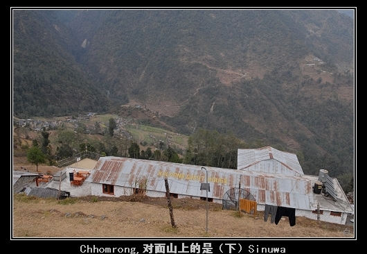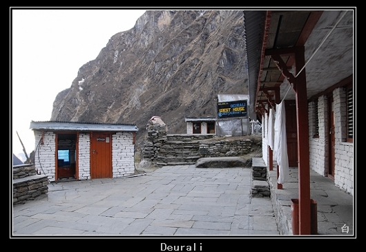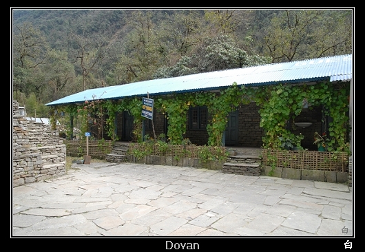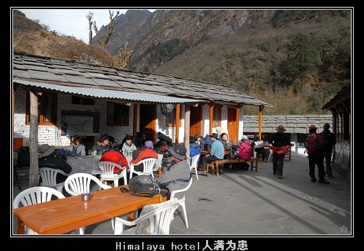 | 3、照例磨蹭到8:30上路,顺着Chhomrong的村庄一路下到河边,Sinwa早以看不见了,其实 Sinwa自下而上也分好几个点,一路上坡,8:45到(下)Sinwa。10:30到(上)Sinwa,然后一路平坡,算是对上午辛苦爬坡的奖赏吧。11:30过了可能就是废弃的ACAP检查站,然后一路下坡到河边的Bamboo(12:00)。吃完后13:00上路,14:00到Dovan,15:05到Himalayan Hotel,被告之由于韩国人及背夫太多,所以无房了。一上火,决定到Deorali再说吧,由于身体不适以及今天路长了点。17:30在日落前终于赶到Deorali,人已虚脱。