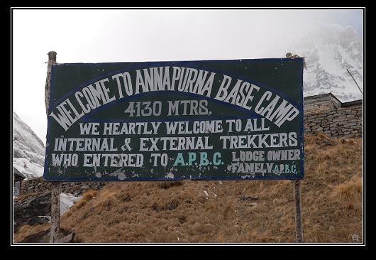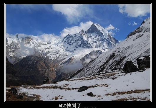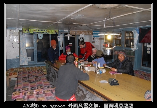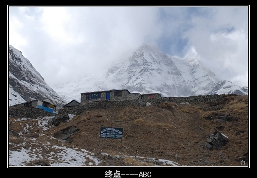 4、由于昨天一天的暴走,今天的行程就相对轻松了。8:00出发,一路不算太陡的坡,突然发现有一条路指向河边,还有插在枝上的布条提示。过桥以后,路越来越难走,不停的在草丛和石头间找路,直到抬头发现对面原来的路上有Porter和行人,才知道走错,只能原路返回,胸闷啊!浪费了半个多小时。10:30到了MBC,喉咙难受到极点,决定多休息会再走,反正问了路人,慢走也只有三个小时了,12:00整出发,爬了一个小时就看到了ABC的兰色屋顶,想着最艰苦的路就要走完,反而有点留恋。放慢脚步,多拍了点照片。13:40到达ABC可爱的小屋,休息了会,14:30起了大风,周围 雪山都隐入舞中。15:00下起了大雪,这时真的庆幸昨天Himalayan Hotel人满为患,否则这时应该还在路上,不堪设想啊!夜里没怎么睡倒不是因为冷,而是喉咙痛的不行,估计这几天压制的病痛都发出来了,可恶的是我的药全吃完了………..