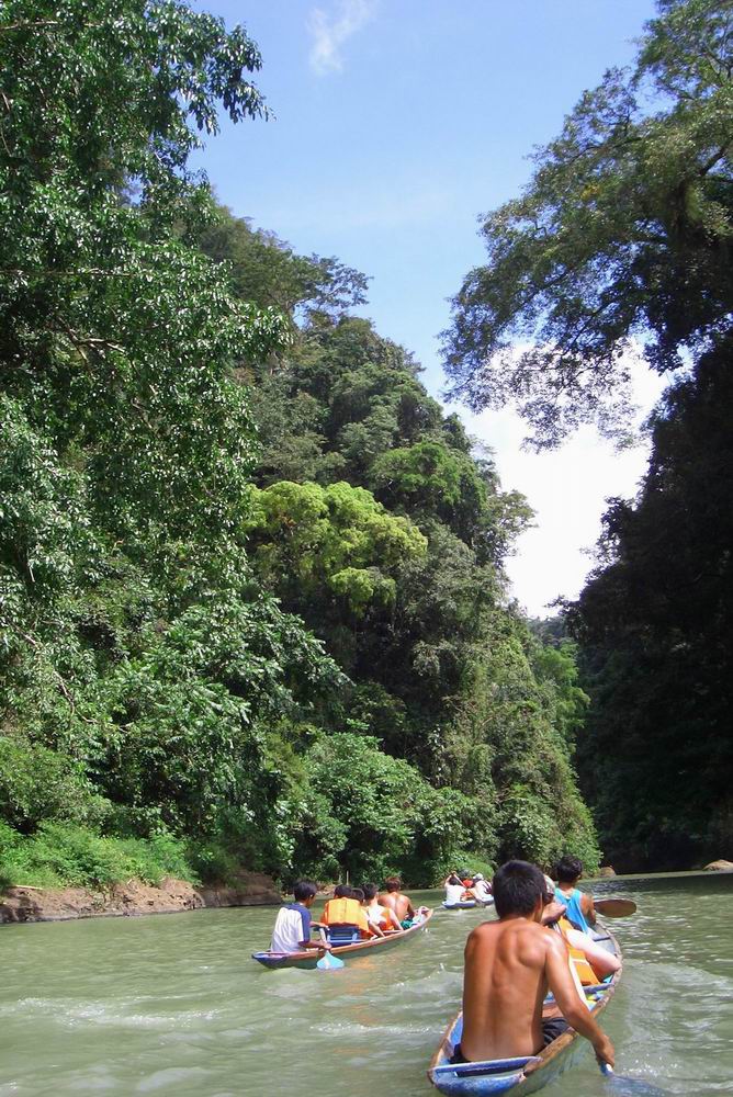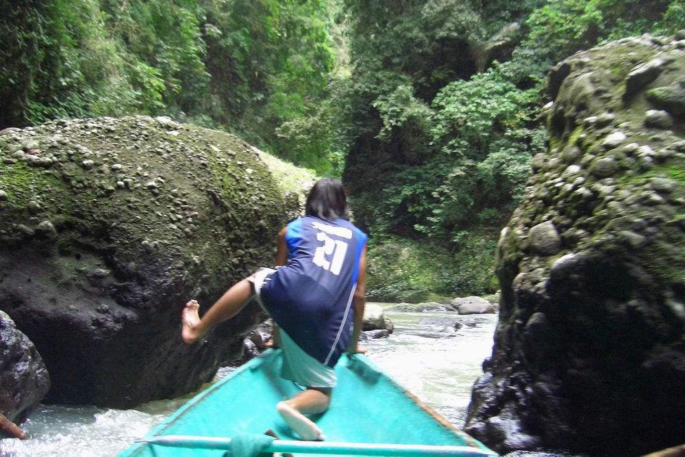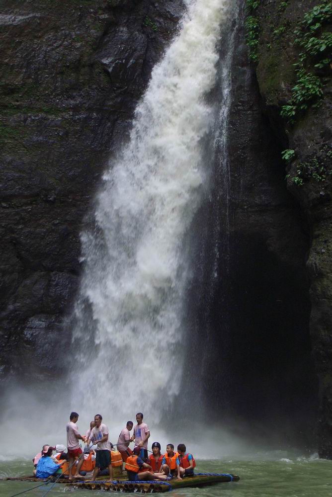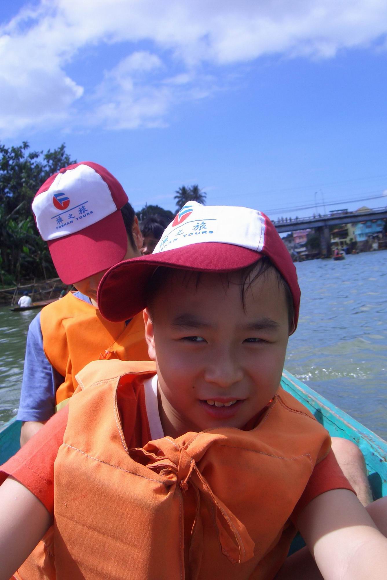 到马里拉的第二天,我们到百胜滩漂流,想到漂流,就想到火辣辣的太阳,我们都预先涂好太阳油,结果旅游车在高速公路上抛锚,导游告诉我们,菲律宾的公交车和旅游车都是拿西方国家的报废车来用,公车是重新装上铁皮并装饰得花枝招展的吉普车。以后的几天,我们都在景点的停车场看到旅游车坏车的现象。两个小时后我们换了一台中巴,赶在中午来到了百胜滩。午饭是自助餐,还送冰淇淋(菲律宾人叫“哈喽哈喽”)里面有刨冰、雪糕、扁豆、果冻。小孩是比较感兴趣的。 饭后我们就下船了。百胜滩的河道不宽,最宽处有十几米,最窄的地方就只有几米,我们一家三口坐上独木舟逆流而上,船夫除了要有大力气外,还要有纯熟的技术,因为到了急流的地方,不仅水流很急,河道狭窄,巨石林立,还要避开迎头过来的船只,撑船的小伙子是菲律宾人,大概也只有十七八岁,黑瘦黑瘦的,却像猴子一样精灵,他的技术在险滩中最能体现出来,手紧握着船壁,双脚在这块岩石上跳到那块上,船只也乖乖地任他摆布,我们离开出发点不久,已经把一同出发的船只远远地抛在后面,儿子很激动,老叫加油,可他又说:我不想船跑得太快,你看这里景色那么美,要慢慢欣赏才行。确实,来到这里,我想起了湘西的勐洞河,也想起了李白《望天门山》里的一句:“两岸青山相对出,孤帆一片日边来。”这里没有长江宽阔浩荡,却有她的秀气,两岸高山早已把赤辣辣的太阳阻隔在外面,看来,地两岸茂密的林中不断传来流水的声音,河的弯道又多又窄,有的时候以为已经到了尽头,突然又阔然开朗,真有山穷水尽疑无路,柳暗花明又一村的感觉。经过十几个险滩,来到河的尽头,这里像一个天池,却不在山之巅,四周给郁郁葱葱的高山围绕,像一位隐士,却又有促势爆发的可能,池上有一瀑布,疑是从天而降,汹涌澎拜,下面有一水帘洞,难道是孙悟移民到这不成?儿子和爸爸准备去探个究竟。他们换上了竹排,往水帘洞进军,我没这胆量,只能在岸边观瞻。从岸上到水帘洞拉了一条绳子,船夫拉着绳子把竹排撑到瀑布的下面,我看他们并没有进水帘洞,而是在感受瀑布的威力。现在儿子说起来还犹有余悸,他说当时接近瀑布时,飞浅的水汽把人压得透不过气,水很冰冷,船上的人都在颤抖,他觉得只有勇士才不会晕倒,他们一船人都挺过去了。虽然没有看到孙悟空的影子,可他们都当了一回勇士。
