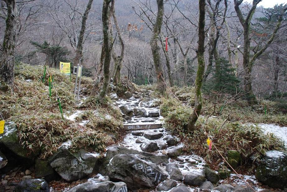 汉拿山是济州岛最高的火山峰,最高峰海拔1980米,登汉拿山一共有四条道路。其中两条较长的道路能够登顶,登山出发的地点一般在海拔1000米左右,所以如果有计划登顶的游客最好安排一整天时间用来爬山。不过海上的火山常年被“陆地积云”笼罩,难得露出全貌,登山山峰后很难登高远眺。在秋天,山上的道路早晨会结上厚厚的一层霜,如果下过雪一样。这个季节色彩很不错,可是登山太冷了点,我们仅在第二天的上午走了最短的路线。