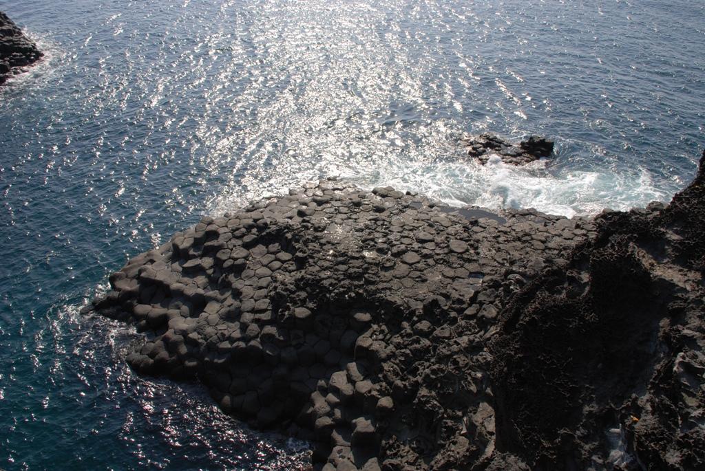 从汉拿山下来,我们重新回到海边,这里有一段叫做海岸柱状节理带的海边就很特别,是熔岩冲到海里,突然遇冷形成的犹如结晶体一般的石群。