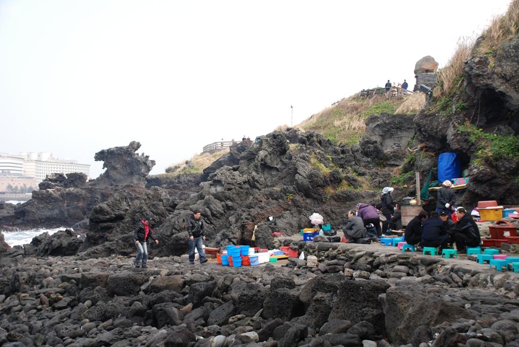 龙头岩另一个让人惊讶的地方,就在怪崖的边上,“阿祖玛”摆了一个生吃海鲜的摊子,很多韩国人就围着吃那些看上去还能蠕动的乌贼鱼和贝壳,想来很多人在韩剧中是看到过的。要是放在国内,这一定会把城管招来的!