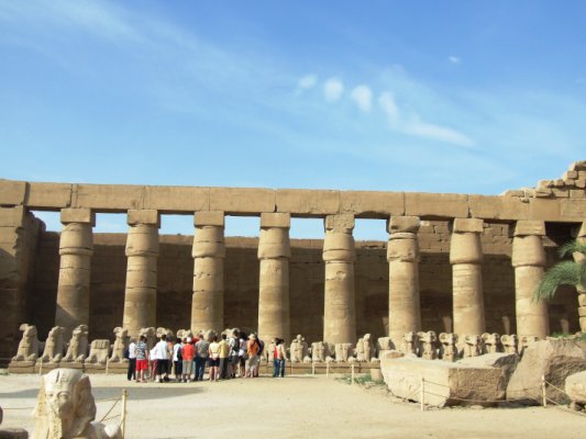 5.3 卢克索-卡纳尔克神庙&帝王谷&卢克索神庙 &夕阳下的尼罗河 从亚历山大回到开罗已经是晚上8点了,我们将乘坐晚上9点的火车前往卢克索。火车的外表很破旧,但是车厢里面比较干净,两人一间,比中国的硬卧车厢要舒适得多。火车上的晚餐也还算可口,就这样,在火车的晃荡中,我们迎来了卢克索! 从火车站下车,我们的第一目的地就是:卡尔纳克!它是古埃及最大的神庙,供奉的是众神之主—阿蒙。实际上是一系列神庙的组合集群,时间绵延达两千年,从四千年前的中王国时期直到接近纪元之初的托勒密时代。 自然,最突出的莫过于新王国时期的拉美西斯二世,由于国力昌盛,上下埃及置于统一的治理之下,北到卢克索,南到阿斯旺,他的足迹踏遍大河上下,建的庙宇环布整个埃及,他的塑像也遍布全国。 卡纳尔克神庙,是我此次埃及之行最为震撼和惊心动魄的景观了,对于它,真的无法用言语来表达什么了。 上图吧~~~