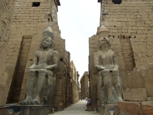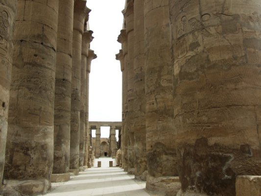吃完午饭,下一站,依然是拉美西斯时代经典的神庙建筑--卢克索神庙。 两座巨大的方尖碑,已只剩下一座;另一座,早在十八世纪末,就由埃及政府赠送给了法国,至今矗立在巴黎协和广场。神庙的石柱,形制与卡尔纳克的不同,是一种结束状的圆柱,柱头是紧闭的花瓣;尽管体量仍比许多现代建筑巨大,但由于造型上的这种处理,却使它不见雄壮而更显精巧。 除拉美西斯二世的巨大雕像外,还有部分体积不大的雕像,虽然残破、但却精美,是由大理石雕刻的。神庙最里面的阿蒙神殿的壁画非常丰富,我携带的旅游指南中很多壁画图都出自这里。