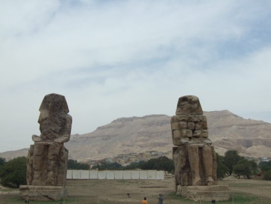 孟农神像,也是帝王谷享庙的一部分,从这两尊庙门前的巨像规模,可以推想当年神庙的恢宏。 神庙建筑本身已经荡然无存,唯有两座巨大的雕像矗立在荒原之上。宏伟的坐像极其壮观,高度在 雕像是坐像,国王正襟危坐,双手放在膝上,身躯、双手、两膝和小腿基本完整。神像的面部已经损毁,左面一座的胸部也已破损,是公元前27年的一场地震毁坏了它们。 据说,在早年,每当黎明之际,破损的巨像往往发出一种凄厉的声响,如歌如泣,因而被称为“会唱歌的石像”。其实,这也许是破裂的石材在低温下收缩时,石头被挤压而发出的声音;也可能是强风穿透石缝时气流的呼啸。但公元三世纪时,罗马人尝试着修复巨像之后,“歌声”从此消失。 面对巍然屹立、神秘庄严的巨像,我们显得无比的渺小,一种敬畏之心油然而起。古埃及人深知,以巨大昭示庄严、以巨大展现权威,以巨大寓意神秘、以巨大震慑心灵。