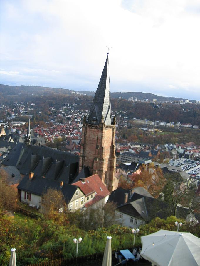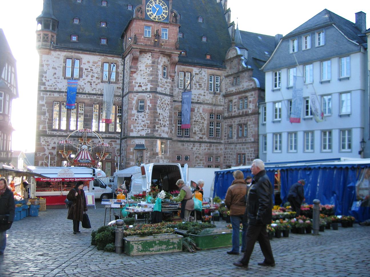 法兰克福作为大家前往欧洲的第一站,往往停留的时间比较短。法兰克福本身而言,在德国并不是特别具有特色的城市,大家在main河畔看到的是现代化的城市,而鲜有德国地区特色的风格。然而,这次我有机会,特地在法兰克福周围的小城游玩了一番,其实与那些大城市或者旅游书上知名的游览胜地相比,这些小城市更加具有德式风情,民风淳朴,安静而适于旅游。 马尔堡是距离法兰克福1小时左右的一座小城,位于黑森州的中部。虽然是座只有7万常驻人口的城市,但是确以大学城著称,因为学生,教师以及为大学服务的人员占到了总居民数的70%,所以由于学生的存在,这是一座充满生气的城市。 从法兰克福几乎每小时有2班慢车前往马尔堡这座城市,票价在14欧左右(单程),如果人多的话,还是选择黑森州的州票比较划算,现价是31欧,但是可以5人同行,并在一天内任意乘坐黑森州境内的慢车以及公交车。 从火车站出来,向左前进50米,即可看到美丽而宁静的lahn河,也被称为兰河(德语Die Lahn)。 小城的中心城区即是老城区,从火车站步行3分钟可以到达第一个重要的景点,伊丽莎白大教堂。这座伊丽莎白大教堂以3个半圆室代替有礼拜堂花冠的法国圣坛,并在正面结构中采用严格的垂直处理,而且塔楼也从基础分离获得独立,成为其后德国哥特式建筑仿效的主要样式。这里曾是图林根州伯爵的夫人,匈牙利公主伊丽莎白从事慈善事业的地方。她被授予圣徒的称号,因此马尔堡也成为了中欧的宗教圣地。每年前来朝圣的信徒成千上万,香火不断。虽然没有科隆教堂那么震撼,但是对于这样一座只有7万人口的小城而言,实在是雄伟壮观。 小城的中心城区是在一座山坡上,被称为oberstadt。沿着古老的有着几百年历史的石板路,前进大约10分钟,就可以来到每个德国小城都有的markt,也就是所谓的市政府广场。在这个广场,每个周六都会有早市,附近的农民将新鲜的蔬菜,水果,鲜花运到城里来销售。但是这样新鲜的商品的价格也是远远超过超市的商品的价格的,所以和国内的菜市场还是不能相比的。虽然城市很小,但是周六的城市确是热闹不已,因为周日的商店都关门,所以大家的购物欲望只能在周日得到释放了。旁边的市政厅上的报时大钟到整点时会吹响喇叭,一只小公鸡会扇动自己的翅膀。 小城的最吸引人的景点,即是还需向上继续爬山的伯爵城堡。伯爵城堡高居200多米小山岗,可让人俯览整个马尔堡的面貌。目前,大学的文化史博物馆是当年的伯爵城堡,马丁路德曾在此舌战旧教徒。因此,在向伯爵城堡攀登的过程中,还可以看到另外两座中型的古老教堂,一座是基督新教的教堂,还有一座是天主教的教堂。两座教堂在半山腰处,相隔不过几十米,很难想象在当年宗教战争中有什么样的情景发生在这两座教堂之间。 伯爵城堡的门票是2欧,内容主要是和这座城市和大学有关。马尔堡大学的全称是菲利普斯。马尔堡大学,就是由菲利普斯伯爵在1527年一手创建的。作为接近500年历史,德国四大古校之一的马尔堡大学,非常重视对自身历史的研究,城堡里的很多展品都是和大学的历史息息相关的。格林兄弟就在这座大学里就读,并在此创作了《白雪公主和七个小矮人》的童话。但是,最让人心旷神怡的莫过于站在伯爵城堡前,了望整个马尔堡城市全貌。 站在伯爵城堡前,感觉整个小城似乎时光停滞在一个世纪之前。德国朋友告诉我们说,马尔堡的老城自上世纪初到现在几乎没有任何的改变,在二战中,这座小城也幸免盟军的轰炸。古老的建筑,街道,招牌都是实实在在的历史文物。 虽然在这座小城的游览时间不过一天,但是我非常心满意足。这座小城让我看到了传统德国人的生活节奏和状态。如果你有时间,这座童话之旅中的重要一站,千万不要错过。