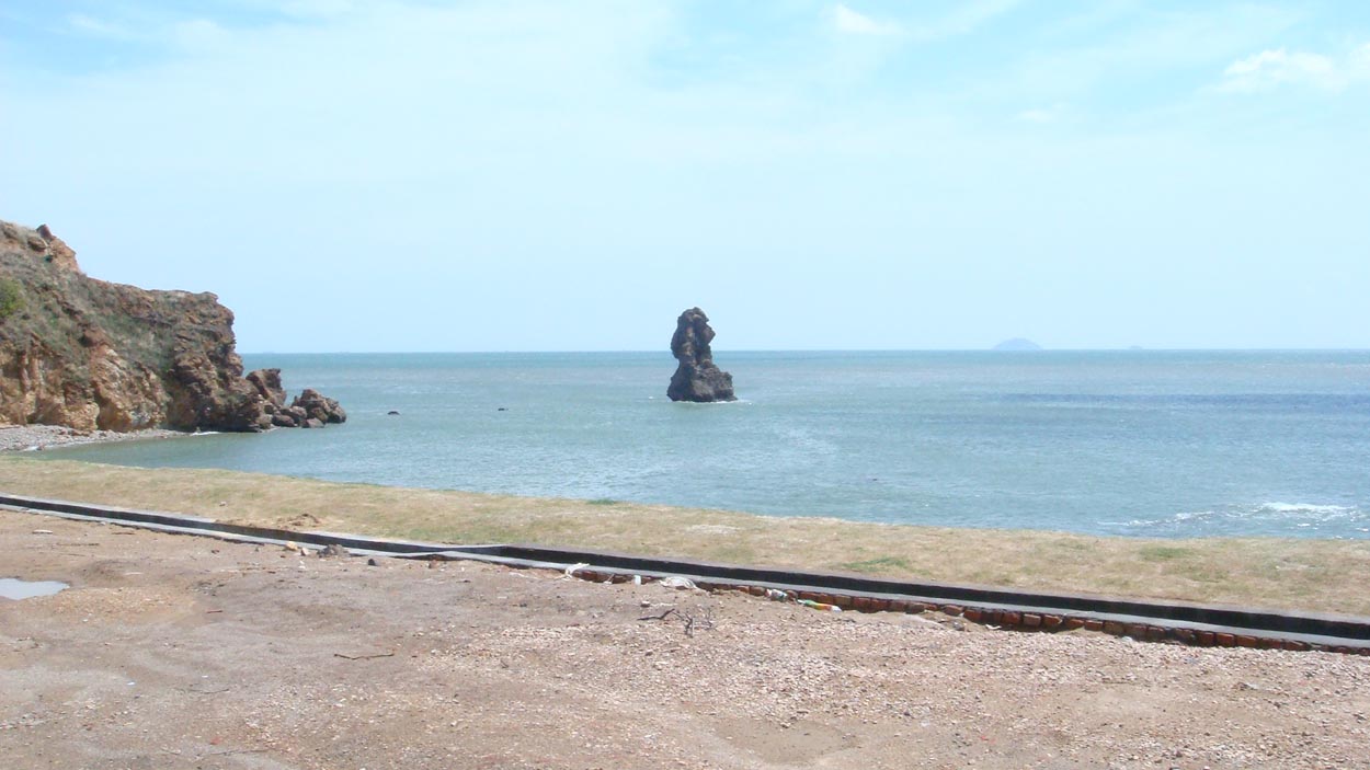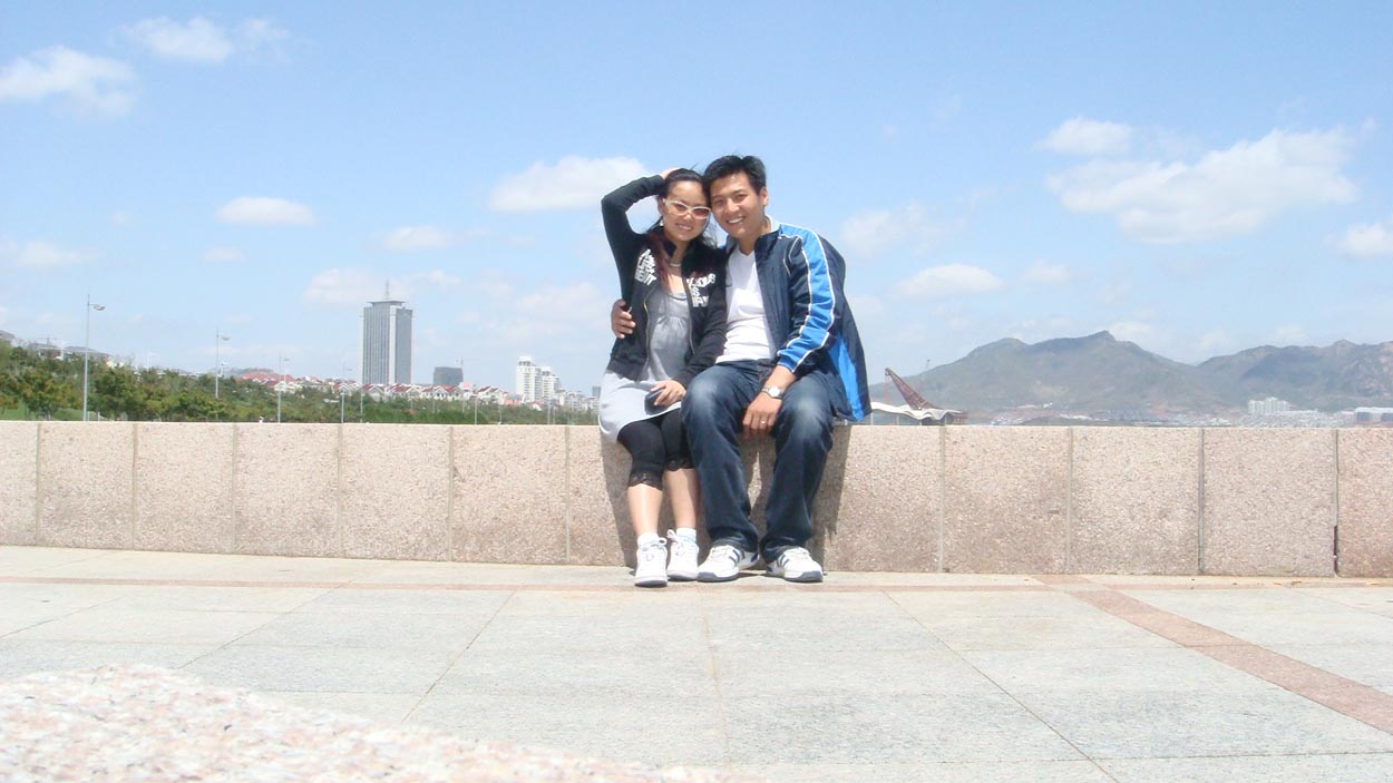 等了半天车也不见来,老公等不及了,那我们就打车把,上车后,司机大哥是个本地人,说话口语很重,他给我们介绍了挺多地方都很好,不久我们就到了石老人,石老人也在修建中,我们匆匆让司机大哥拍了张合影又继续上车(因为比较匆忙,没有看出是个老人在钓鱼的样子,不过景色是很美)。