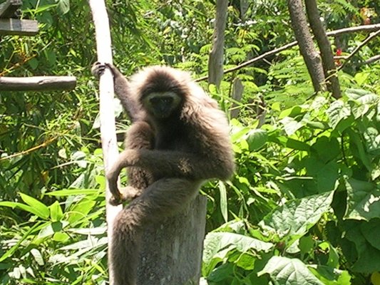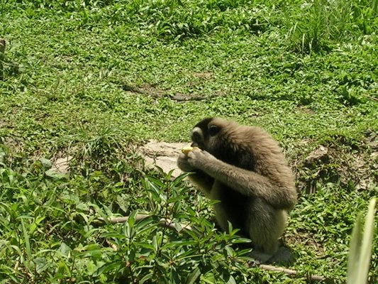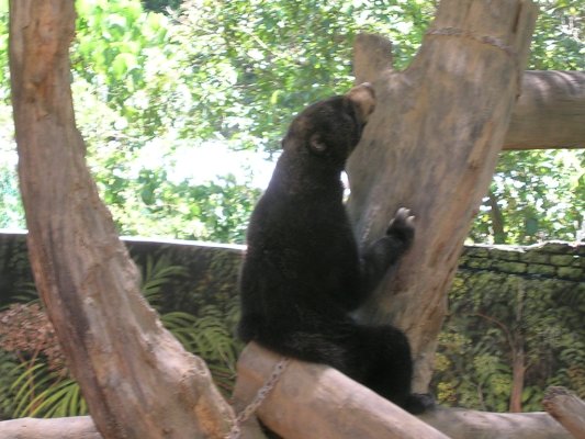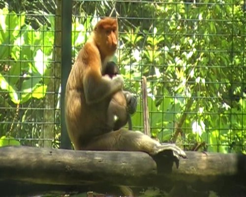 今天(4月9日),根据昨天的决定去沙巴动物园看长鼻猴。沙巴动物园离开市区很远,经过多方打听,问清了方向。 早晨先去吃早餐。几天早餐吃了几种东西,今天再去看看有没有新的口味,换换品种吃。从旅馆出来向码头方向走去,过了几个街口,看到有一家华人茶餐厅,店里人头济济,门口有一纸广告--鱼滑面,我们第一次看到这个名字,于是进店察看。他们用鱼肉打成鱼浆,自制各种类似我们吃的鱼豆腐一类的配料,形状有丸、块、片的,这个就叫鱼滑。放在汤里煮,等面下好后,从汤里捞起鱼滑盖在面上,加上汤就可以吃了。鱼滑面因为都是鱼做原料,吃起来很鲜美,有嚼劲,口感很好,汤水也非常鲜,价格也不贵,每碗5马币,难怪生意这么好。第二天下午我们再去的时候看见这家店打烊休息了,经了解才知道这家店只做上午,下午和晚上都不营业。这也是马来西亚的一个奇怪现象,通常那些食店(可能仅是华人的店,没考证),特别是那些有名气的店,生意再好也有休息天,,店里的墙上挂有牌子,写着几月几号休息的字,是提前告诉那些老顾客不要跑冤枉路。而且好多店是做半天的,有的上午营业,有的下午营业,如吃肉骨茶有名气的“佑记”就是只做下午的。不像我们国内那些店主,如果生意好最好每天有28小时,可以一直做。 吃罢早餐,按老规矩去买水果、面包,带去动物园。因为那边是很偏僻的,吃饭肯定不方便,后来证实我们的判断是正确的。 昨天就打听好路线,乘17c路迷你巴士,到终点再打的10马币就可以到动物园。在旅馆对面的迷你巴士站坐上巴士,为了再确认是否有误,就再向司机询问,司机是马来人,不懂华语。正巧,车上有个华裔小伙懂一点华语,就由他告诉司机,我们去动物园。马来司机知道了我们是去动物园就主动提出,大概意思叫我们加点钱,就用这巴士送我们去(我们想明白了,为什么在马来西亚等巴士是没时间的),那小伙也没有告诉我们要多少钱,也可能我们听不懂他那夹着英语还是马来语的华语,我们考虑在巴士费上顶多再加10马币的出租车费或者再稍多一点,可以省得转车,也就同意了。我们付了50马币买票,那司机收了钱就不找钱给我们。因为不懂他讲话的意思,所以就想等巴士到终点再说。我们看当地马来人上车买票最多就是2马币,那么直接送我们去动物园收20-30马币也就差不多了。可是巴士到了终点他没有要找钱的意思,我们只能用仅有的“找钱”的英语单词--change,并用手势做动作,要他退还多余的钱,起初他装聋作哑,嘴里咕噜咕噜说我们听不懂的话,看得出就是不想找钱。这可恨的马来人惹得我们发火了,于是就提高嗓门向他要 ,他见势不妙,就乖乖地从口袋里掏出40马币给我们,扣了10马币,我们也不知道究竟是多少巴士费,再加上语言不通,心想已经找回40马币也就算了,省得在啰嗦。终点站是个小集镇,就在路边上叫了出租车10马币到动物园。因为动物园很偏僻,人很少,担心回来没车,就和出租车司机约好,等我们出来打电话叫他来接。 沙巴动物园很小,而且没什么参观的人。,但是门票却不便宜,每人20马币。我们去动物园的目的是看长鼻猴。 长鼻猴是马来西亚仅有的珍稀动物。长鼻猴又名天狗猴,这是一种奇妙的生物,有着长长的大鼻子,表情滑稽可爱。他们的鼻子大得出奇,其中雄性猴子随着年龄的增长鼻子越来越大,最后形成像茄子一样的红色大鼻子。它们激动的时候,大鼻子就会向上挺立或上下摇晃,样子十分可笑。而雌性的鼻子却比较尖。岁大的雄猴,鼻子可垂过下颌。但能上下动,左右摇晃,不影响吃食。 所以要分辨公、母长鼻猴其实还满容易的,公长鼻猴有个超级大鼻子非常奇特,年纪越老的公长鼻猴鼻子越大,就彷佛是地位象徵一般,可是非常能吸引母猴子的唷。母长鼻猴就没有公长鼻猴那大鼻子了,而是以尖尖可爱的小鼻子展现幼猴很调皮,常戏弄父母,一会儿拧它们的鼻子,一会儿摇它们的尾巴。只见一只公猴爬到一只母猴身边,把母猴怀中的小猴抱走,小猴不肯,在公猴手里挣扎后逃脱,马上又回到母猴身边,躲进母猴的怀中,非常有趣。猴群中另一头大公猴,仪态大方,从容不迫,坐在枝干中间,任凭怎样拍照,兀自岿然不动,看来是见过世面的。在猴类中,长鼻猴是对饮食非常讲究的一种,它们的胃口也很大,给它们吃的东西也考究,吃的都是香蕉之类的东西。 红毛猿学名叫Pongo Pymaeus,又叫红毛猩猩。据说它与人类有百分之九十六点四相似。红毛猿全身长着红褐色的粗长的毛发,只有脸部光滑无毛。上肢比下肢长,手足的姆指均很短,无尾。雄猿成年后,喉袋会渐渐松弛垂至胸部,脸颊两侧及眼睛上方会长出大块肉瘤般的赘肉。幼猿肤色金黄,成年猿则为深棕色。因伐林、种植及非法猎杀而流离失所的红毛猿已经濒临灭绝。1964年,马来西亚政府在进行开发的同时,辟出专门的原始森林保护区,目的是为了收养照料和训练流离失所的幼猿。受到良好保护的它们,有些已经和人类相处得难舍难分,不愿再回到森林,每天在特定时段、地点取食,不用到处流浪,到处找食。也只有这样,在这个时候,游人才有近距离接触它们的机会。 沙巴动物园的马来熊也是一个看点。马来熊是熊科动物中身形最小的成员。别名狗熊、太阳熊,马来熊全身黑色,毛短绒稀,乌黑光滑,体胖颈短,头部短圆,突出的口鼻部分呈浅棕或灰色,两只圆耳朵很小,位于头部两侧较低的位置上。 前胸通