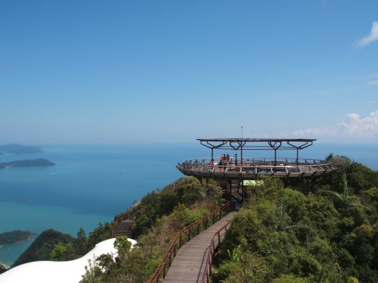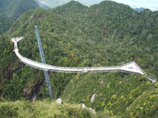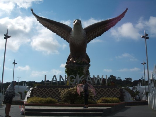 今天(4月12日)一早搬好旅馆,抓紧时间游览兰卡威。 兰卡威(Langkawi)当地人称为浮罗交怡群岛,位于马六甲海峡和安达曼海之间,马来西亚和泰国边境交界处,在马来西亚半岛西北端的海面上,距槟榔屿108公里,由104个小岛组成,涨潮时仅能看见99个岛屿。主岛是兰卡威岛(Langkawi Island),它是群岛中唯一一个有定居者的岛。早就听说兰卡威算是东南亚最令人向往的风景胜地,清澈碧绿的海水和绵长平缓的沙滩,葱郁繁茂的森林与神秘而壮观的岩洞,一座座风格各异、设施一流的酒店、度假村及丰富多彩的水上娱乐项目构成了天堂般的海滨度假圣地。热带雨林中栖息着很多可爱野生动物,自然生态非常的好。岛上还有几个美丽的海滨高尔夫球场及诸多免税商品,海上的一些小岛也是潜水、浮游爱好者的乐园。除了美丽的自然风光,兰卡威更有着悠久的历史和传统文化,在兰卡威的99个热带岛屿上,流传着各种稀奇古怪的妖魔、巨鹰、战士、童话公主等民间故事和神话传说。岛上到处都能享用到中国、印度、泰国和马来风味的美食。岛上居民热情好客,民风纯朴,平和安闲。四季气候宜人,白天只要不在烈日下也不会感觉炎热,晚上很是凉爽。真是一让旅行者痴迷和沉醉的度假圣地和购物天堂。岛上多是欧美游客,亚洲面孔多是香港人,本地同胞比较少,出发前在网上查游记,比起普吉岛和巴厘岛简直就是没什么攻略可参考。 在兰卡威,最标准的装束是T-shirt、短裤加拖鞋,非常休闲,这套打扮可以在任何高级酒店大摇大摆的进出。兰卡威岛还是"快捷结婚天堂",是探幽者寻求假日情趣的最佳去处,据说来岛的人可在一天内取得当地国家注册部门办事处核发的结婚证书,并在岛上举行婚宴和蜜月,不过这只是听说,没有考证过,不知真假。 兰卡威的海边有一个占地面积很大的广场--巨鹰广场,广场上矗立着被称为兰卡威新地标的鹰塔(Dataran Lang)。Langkawi在马来古文中是“红褐色老鹰”的意思,鹰塔也就是兰卡威的标志,鹰塔建于1996年10月,塔高45米,耗资1000多万马币,老鹰的雄伟姿态,象征着兰卡威就象展翅高飞的老鹰一样,未来的经济更加蓬勃发展。 整个广场还有景色优美的湖泊、喷泉、小桥、回廊等,规划完善的广场,是个欣赏夜景、享受海风吹拂的好去处。 我们叫了一辆出租车(30马币)出发前往东方村,东方村一个集购物、文化、美食以及玩乐的交汇点,为了显示亚洲的美食和烹饪技术,东方村特设了一些以优秀及高贵为主题的餐馆。那里还有缆车可以到达全岛的制高点,不仅可以俯看全岛,据说还能看到泰国的边界。我们到达东方村的时候刚下起大雨,下车找地方躲雨,不一会雨势渐渐小了,我们就冒雨进村。 东方村的建设为兰卡威多增加了一个极佳的景点。村里的建筑呈多元化形式,各国的建筑风格在这里都能找到,各种风格的建筑粉刷着各种艳丽的涂料,显示建筑的特色,成为东方村的一大亮点。由于大雨,缆车停开。我们就在村里游览,拍照留念,不一会,太阳出来了,我们赶紧去缆车站,正好刚开始售票,我们正好是第一批游客,买好票就等待空中纜車的到來。 1.2.3.4.5.6.一個蘿蔔一個坑 在搭纜車的平台上,因為空中纜車一次乘坐六人,所以地板都會畫有六個一排的方格,讓遊客依序排隊。可当缆车开到一半的时候,山谷里的雾气开始升腾,车厢周围烟雾缭绕、虚无缥缈、如入仙境,随着缆车慢慢上升,穿出云层,又像进入天国,朵朵白云踩在脚下,犹如腾云驾雾、飘飘如仙一般,紧接着就到了缆车的中间站。走出缆车车厢看到除了换乘再上另一段缆车通道外,在右侧还有一个通道,可以到空中吊桥上去,由于刚才下大雨,伴有大风,吊桥关闭,还没开放。通道口有两个管理人员坐在那里聊天。我们上前做手势加简单的单词询问,回答是可以。我们第一批登上了吊桥。 这座吊桥全是用不锈钢制造而成。它呈一个特大“s”形用钢索吊在两个山头之间,在郁郁葱葱的山林间划出一道漂亮的弧线,展现出它那优美曲线,桥身在强烈的阳光照射下发出耀眼的亮光,整座吊桥显示出设计者的气魄,构思新奇,独具匠心,在青山绿水之间相映成辉,相得益彰。上桥时,桥上空无一人,我们在这现代化的建筑上的一边尽情寻找山间野趣,在另一边眺望海天一色的秀丽风光,心情豁然开朗。好景不长,慢慢的有人也跟着上来了,大家欢快地才桥头跑到桥尾,再折返,寻觅最佳角度留住大桥的倩影。 走出吊桥,又登上缆车向山顶出发。山顶上有两个巨大的观景台分别建在两个山头上,由一条走廊把两个观景太连在一起。观景台有两层,要欲穷千里目,就要更上一层楼,顶上视线开阔,兰卡威的全貌一览无遗,在观景台的四周分别按不同的方向挂上指示牌,游客可以按指示牌的方向可以看到兰卡威各个游览去的美丽风景。 回旅馆洗澡降温后,晚上去露天市场逛。市场是以小吃为主,马路两边大都是小吃摊,有炸香蕉、炸小鱼、炸鱼丸,烤鱼、烤虾、烤鱿鱼、烤玉米,什麽粉、面、饭的全部都有,我们一边走、一边看、一边吃,等走完、看完、也就吃饱了,最后还在水果摊上买了个榴莲,蹲在马路边吃。