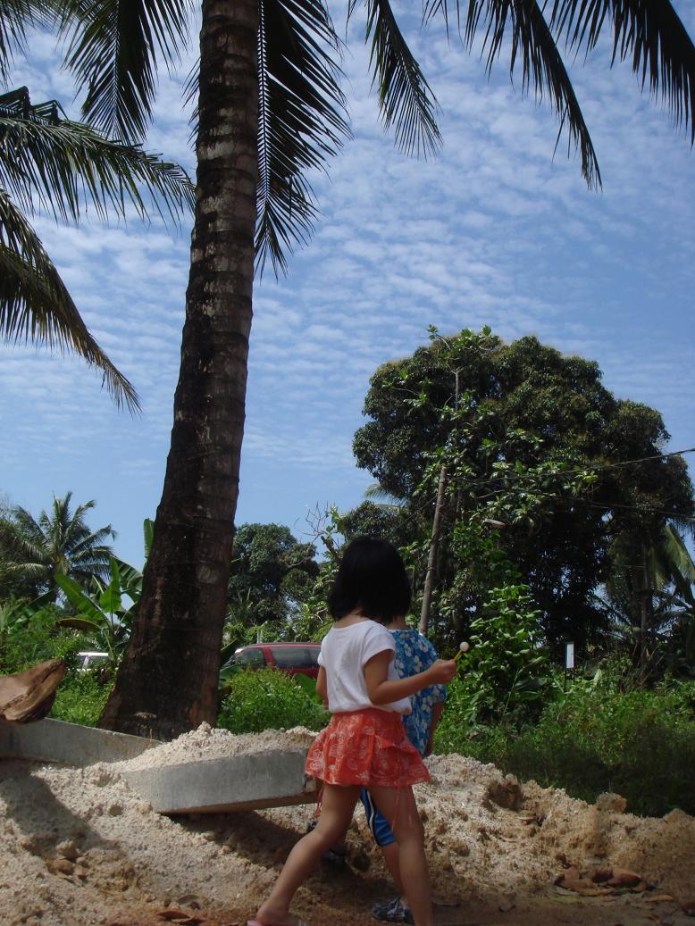 很快就到码头了,有个穿红衣服的男子,正在一棵高大的柚子树上摘柚子,一个小男孩在树下守,我帮他接过摘下的柚子。后来才知道,这是没有主人的树,可以随便摘。所谓码头只是一个小渡口,有一个凉亭式的木屋,旁边有几棵椰子树,上面结着许多金黄色的椰子,还不少掉落在河边。有几个少年在附近聊天。宽阔的河面,流淌着略带浑浊的黄色河水。据说河中有鳄鱼,决不可下河游泳!河对岸是大片的油棕树。太阳出来,后天气很热,真想喝点椰子水。隆说,他妹妹家有椰子树,不如顺道去走走。很快就到了她家,这是一个位于树丛中的独立屋,周围都是各色树木,既有果树也有花草。有椰子、红毛丹、扶桑花……全家人正在大扫除,见我们到来,放下手头的事情,热情欢迎我们。隆的妹夫搬出梯子到屋边的树上採了很多椰子给我们。