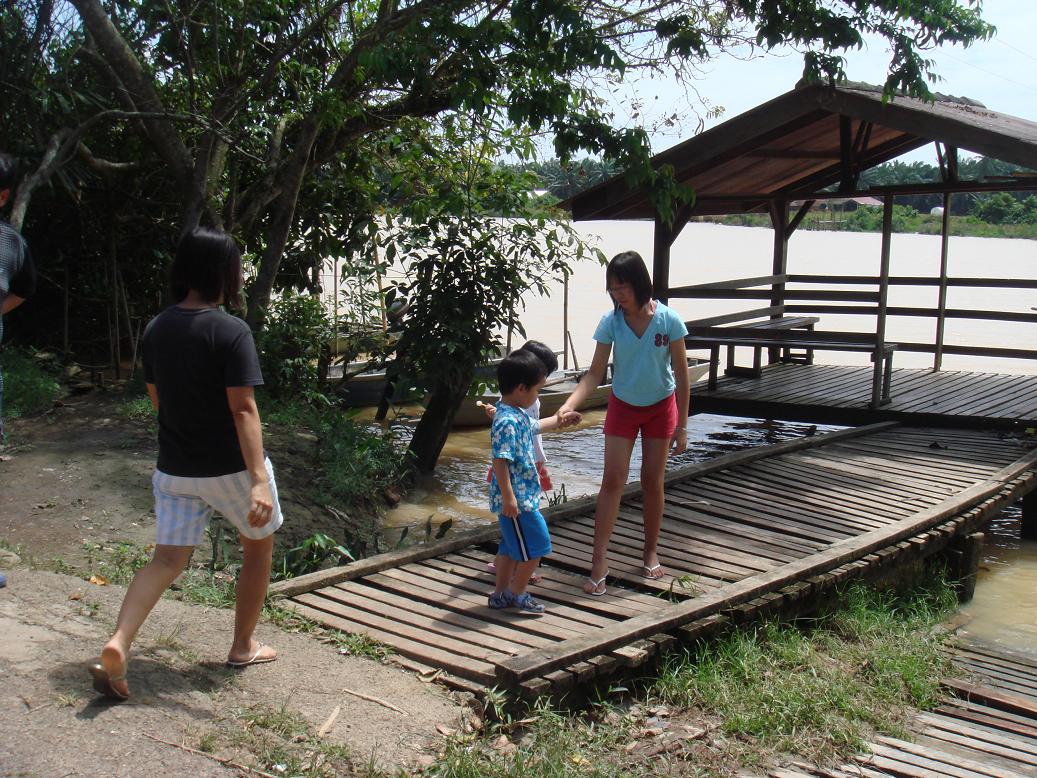 回到蔴坡已经五、六点钟了,但是天还很亮,Leo在车后座睡着了,不敢叫醒他,让他睡个够!榔姐的儿子们都回来过年了,一起聚在辉(榔姐的六子)家吃晚饭。辉妻珍自己做了几个菜,味道还不错。辉的房子与他父母的房子中间虽然间隔了一户邻居,但还是相当方便,前门、后门都可以相通。大门外种着同样的果树,树上结着比拳头大一倍的果实(油炸后可以吃)。屋前的小院子是修整得很漂亮的草坪,安置着休闲用的石桌、石凳。屋里收拾的很整洁。现代气息较浓,体现出两代人之间的差异。当晚我们搬去住在辉家,Leo很快就和辉的小女儿-四岁的莹熟悉,高兴地一起玩耍。由于我们的到来,辉的其他几个孩子就住到附近的外婆家。他们的外婆2006年跟随榔姐一起来过泉州旅游。 早饭后,隆开车带我们去蔴河边的码头玩,珍母女三人同往,她的小女儿莹已经是Leo的好朋友了。这两个年龄相仿的孩子会手牵手一起玩。路上经过榔姐家的旧居,他们念过书的华文小学。当时隆妻梅的父亲是该校校长,梅家就住在学校里,课余时苦练乒乓球,竟成为国手,1976年代表马来西亚到北京参加世界乒乓球大赛。还和周恩来总理等人合影。
