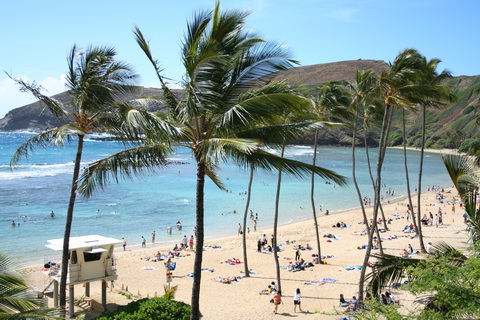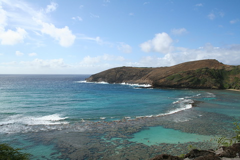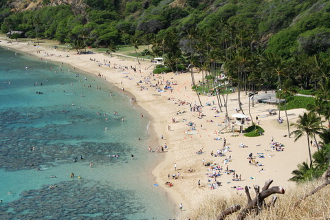 欧胡岛东南的Hanauma Bay是有名的浅水浮潜海滩。远看恰似海湾中横卧了一条恐龙,Hanauma Bay中文叫恐龙湾。浅滩下的珊瑚礁隐隐约约露出水面,千枝万杈的珊瑚丛中隐藏着各色海洋生物。很久以前当地人就禁止在这里捕鱼,加上湾里滩浅,海水透明度高,因此这里就成了人与热带鱼同乐的好场所。只需戴上潜水镜,向海里多走两步,把头埋进水中,就可以看到五光十色的热带鱼在珊瑚丛中嬉戏的身姿。运气好的话,还可以看到海龟。