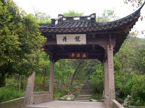 龙井诗碑廊东北处是“过溪亭”, “过溪亭”下有座过溪桥,桥下泉水淙淙,汇水成龙池。乾隆曾驻留亭边,凝视池水,感慨道“此泉永不枯竭”。 过溪亭又名“二老亭”。相传苏东坡上山拜访高僧辨才,两人一见如故,秉烛夜谈,次日辨才亲自送苏东坡下山,后人在二人送别处建亭,名“二老亭”,两侧有龙池、泻池。过溪亭周边农居进行了立面改造,呈现西湖传统民居风格。