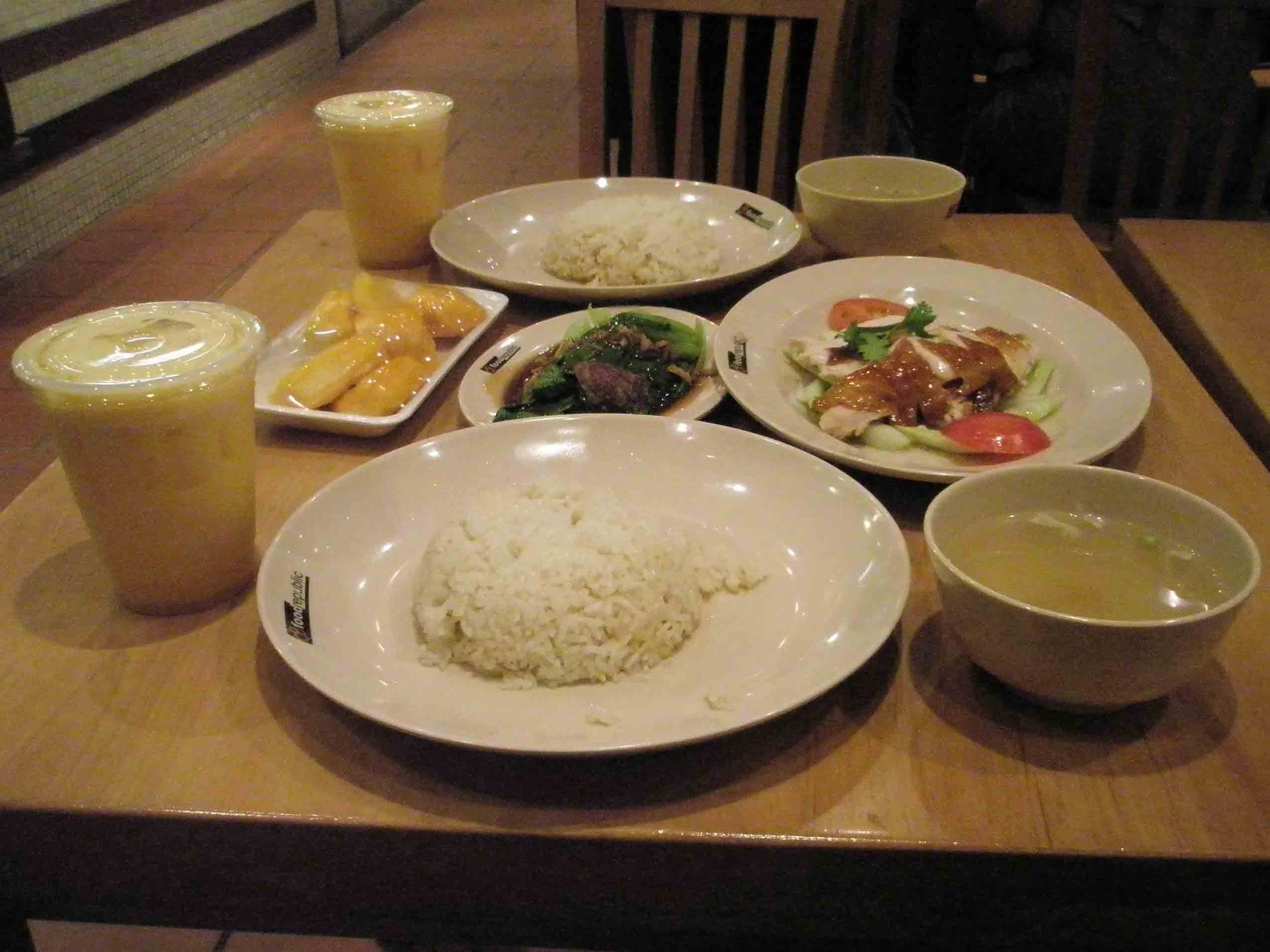 ( 在地铁站门口买了2新币的菠萝蜜,来一趟新加坡总得尝尝热带水果吧。始发站人并不多,但距离乌节路20多站,尽管预料到了路途的遥远,但颠簸了一个小时的我们下了地铁已经饿的头晕眼花了。 乌节路是新加坡最著名的商业街,地位如同北京的王府井、上海的南京路一般,沿街各大商店几乎云集了世界上所有的著名品牌。不过我们可没有能力先逛街了,直接走进第一家商场,根据我们的经验,所有大型商店一定有美食街。不同于一般商店美食街在地下一层,这里的美食街在顶层,中文名字叫做大食代。看到名字我们有些庆幸,网上一直推荐的品尝新加坡美食的去处竟然被我们无意中发现了。 一份海南鸡饭套餐,两杯橙汁下肚,我们才慢慢有了说话的力气,开始品味新鲜的菠萝蜜。第一次吃到菠萝蜜,它的核竟然如此漂亮,像布满花纹的贝壳,挑了最漂亮的一个核准备带回来留做纪念,可惜路上挤坏了。 大食代的各家铺子前面都贴着年代久远的报纸,介绍着各自的历史,我们点的这家海南鸡饭也是一样。鸡肉很嫩,配上黄瓜吃起来很清爽,完全没有油腻感,确实很好吃。媳妇吃的也是直说不错,不过吃完又习惯性的打起了临铺肉脞面的主意。 终于又有活动的力气了,我们开始沿街而行,大部分商店我们只是走马观花的看一看,照个像而已,走到义安城,媳妇提议进去转转。义安城是乌节路上最大的商店,不过外表看起来没有北京的新天地面积大。在这里,我见到了真正的LV。 媳妇在义安城终于买到了称心如意的耐克鞋子,终于可以不穿着拖鞋回到北京在寒风中行走了。新加坡的标价总是那么有迷惑性,七八十的价格只要不换算成人民币,怎么想也觉得很便宜,有一种再买一双的冲动。 乌节路还没有济南的泉城路商业街长,很快我们就“看”过一遍,当然要是真挨家仔细逛,这里的品牌恐怕再给我们三天也看不完,不过我们也没有来新加坡购物的计划,我们的经济实力还配不上这里的牌子,还是国内的服装比较便宜。 晚上约了Mrs. Qin在新加坡河附近见面,我们决定先去河畔吹吹风,休息休息,等待Mrs. Qin,也等待晚上的大餐……