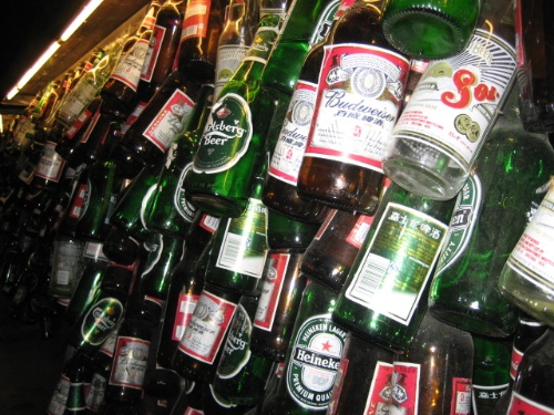 第三天,是我们离开张家界、离开小石的日子。 早上乘坐索道下了山,在“武陵源”与小石合照,吃过午饭,我们就搭上了开往凤凰的车。 一路上,司机使出浑身解数,频频超车,即使在盘山公路的拐弯处也不例外,简直就是F1,把我们吓得睡意全无。 幸亏坐在我们周围的是几个广州同志,上午下山的时候与他碰过面——后来才知道,他们其实与我们同坐一列火车、同在一个车厢内。其中一个“口水老”(虽然绰号并不悦耳,但充分体现了我们对他的喜爱之情)全程都在表演“栋笃笑”,把我们个个逗不亦乐乎。 担心了4个半小时,我们终于来到了朝思暮想的古城——凤凰。 可惜找客栈耽误了不少时间,于是晚上无法安排活动。 晚饭在“原始人酒吧”解决。我很喜欢那些挂在篱笆上的空酒瓶,很雅致。