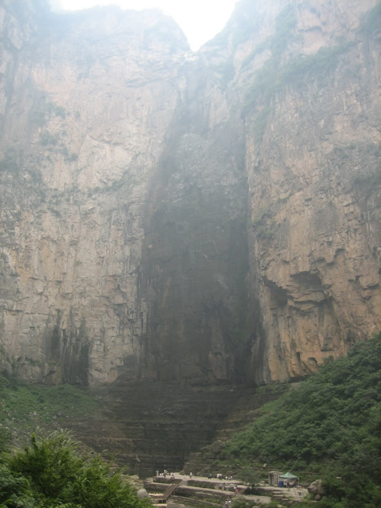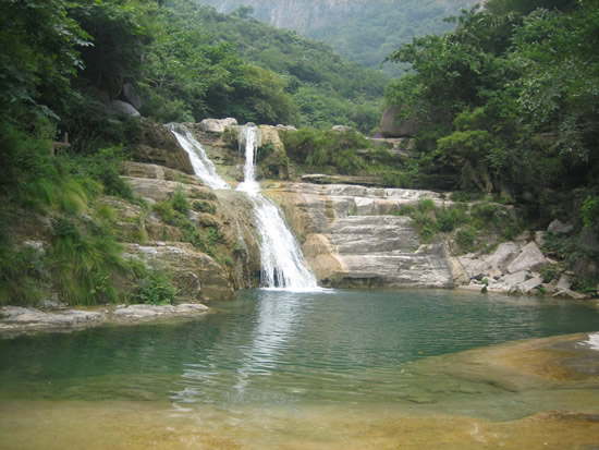 8月3日上午10:30团 队才集合出发,首先去了焦作的一个土特产品店品尝和购物,吃过中午饭到达云台山景区已经是下午两点钟了,多半天的时间被浪费掉了,这也是参加团队不能自主 旅行的无奈。今天的旅游景点有三个:小寨沟(潭瀑峡)、老潭沟(泉瀑峡)和猕猴谷,这三个景区都从一个检票口进入,一般也是三个景点一起游玩。进入景区后 首先看到了太极表演,在溪流当中的圆形台面上一位小伙子正在表演太极拳,动静结合、刚柔相济,如行云流水,甚是好看,每逢整点就会有二十几分钟的表演。再 往前走大约五分钟就到了小寨沟。小寨沟是云台山峡谷极品的主要代表,全长2000米, 顺畅时大约需要一个半小时左右。峡谷内“三步一泉,五步一瀑、十步一潭”,秀美风光令人流连忘返。情人瀑,瀑分三层,且每个断层都有两条瀑布相吸相融流入 一个潭里,如情人耳鬓丝磨,窃窃私语;丫字瀑,瀑高十余米,瀑下潭深五六米,挂在两层山阶上,呈丫字形;试剑石,传说唐王李世民在讨伐刘武周时,竹林七贤 之一向秀的后代向李世民献宝剑-嵇康剑。李世民执此剑朝此青石连劈两下,至此石上仍留有剑痕;“U”型山谷,已是小寨沟的尽头,一面敞口,三面环山,山谷内有龙凤潭,潭水清澈,水底地面全由鹅卵石铺就而成;龙凤壁,自然天成的龙凤呈祥图;蝴蝶石,翩翩起舞,展翅欲飞。 ![]() 丫字瀑 ![]() 云台天瀑 游览完小寨沟,直奔老潭沟,沟长3000米, 游览完老潭沟,为赶时间中途坐了段电瓶车,5元钱一公里,来到猕猴谷时已经是下午5:10啦,猕猴谷是云台山风景名胜区向游客新开放的一个景点,有数量众多的野生猕猴,每逢整点都有驯猴表演,大约经过十几分钟就可以攀登到山顶,见一座小亭内正在进行驯猴表演,5:30表演结束。再往山上看,房顶、树上有众多的猕猴,毛长体壮,形体俊美,行动敏捷,攀援嘻戏,很是热闹。没有时间逗留啦,下午6:00赶到了停车场,结束了云台山之旅。