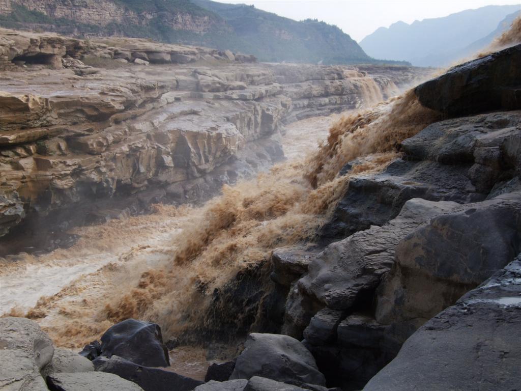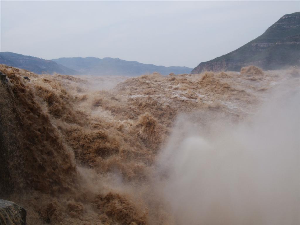 1345 我们抵达宜川汽车站,告别了那辆最后阶段每公里只开 1410 我们坐上了周老的普桑,周老看似憨厚,开起车来却着实狂野。除了在经过宜川县公安局门口时略有收敛,其它时间在309国道上一路狂飚,可惜普桑性能欠佳,不然周老漂移过弯超车的英姿一定很赞。 1500 经过一路颠沛流离,我们终于从西安来到了壶口,由于在此之前的4天连续下雨,因此今天黄河水量丰沛,远远的我们就听到了他的低吼。走到近处,更是看到滔滔的黄河水汹涌而下,伴随着巨大的轰鸣,蒸腾起滚滚的白烟。正当我站在河岸边欣赏黄河雄浑壮阔的美景时,妞妞屁颠颠的走到我旁边来了一句:很像可可牛奶的诺。 我- - ![]() (壶口1)