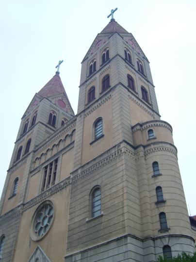 之星旁边是荒凉一片呀,看来下次还是不要入住这里好,实在是.... 9月28日睡到8点多才起来(比起旅行社让客人5:30起床天差地别呀),差点就错过了锦江之星的早餐了,也 许是因为上次在杭州的锦江之星觉得早餐不错所以这次依然选择在店里吃,但是这次太让人失望了。 我们沿着中山路走发现有一家格林豪泰看上去挺漂亮的,抬头一看原来天主教堂就在上面,刚好是星期日有 很多人来做礼拜,本来是不让游客进去的,不过因为有些人来做礼拜晚了所以他们进去时我也跟进去了,虽 然我不信这个但是看看应该也无妨吧。就是奇怪的事来做礼拜的大多是韩国人,还看到一男人在忏悔,本来 我也真想过去弄弄的,但是因为老公不肯进来我也只好看一下就出去了.