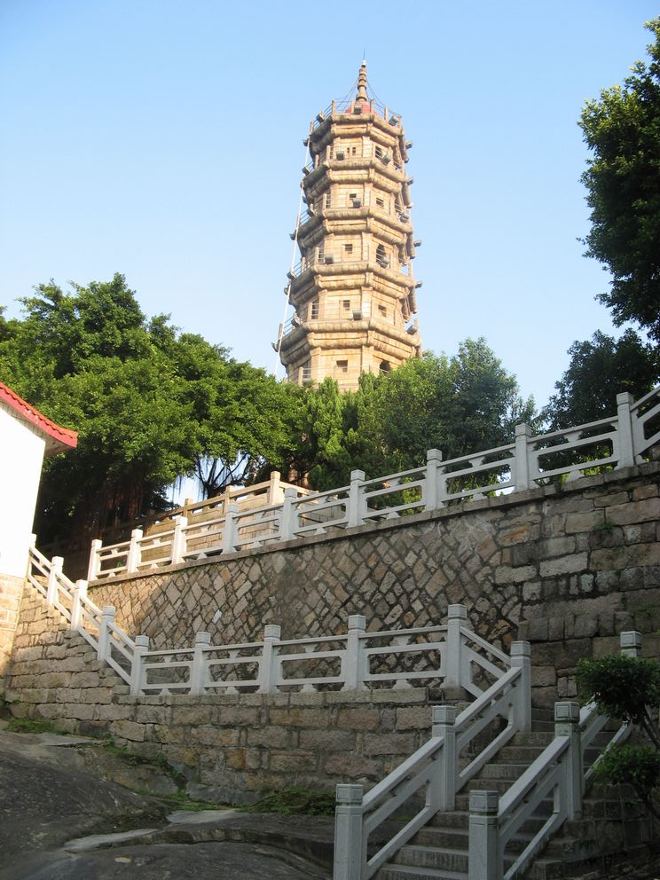 鼓山,福州第一站。是一个很好的爬山的天气。原本说是有台风的,可是今天天气大好,阴晴阴晴的。很快决定了,于是坐车,然后转车,四个人出发前往鼓山。在去鼓山的路上,看到了于山和乌山的两座塔:白塔乌塔。很漂亮,大概有七层左右,晚上的时候白塔上还有灯光装饰,看上去漂亮极了。忘记是几点到的鼓山了,反正是坐了很久的车。因为鼓山的形状像鼓,所以福州人就把它叫做鼓山。山下有索道通往鼓山十八景,一次来回30人民币,可是年票却是20元每年。怪事。呵呵。鼓山不是很高,一路登着石阶,路上还遇见许多小孩,有的一鼓作气爬上去,有的半途要家长背。哭笑不得。登上了十八景,想在观景台上看看福州面貌,可惜人太多,挤不进去,勉强能瞥一下。继续往前走,越来越多的石刻出现。在上山的途中,还有看到打广告的石刻,完全懵了,这什么跟什么嘛。而过了十八景后的石刻才比较“正常”,什么“慧日辉煌”“斗佛”“天地正气”“皆大欢喜”等等,N多。走着走着,走到了涌泉寺。居然门票要50元,在网上查了下,似乎6元就可以了,却没想到涨成这样。我不是信佛的人,所以没进去,但是我对佛始终保持着一种“宁可信其有,不可信其无”的态度。从涌泉寺下来,看到一条大道,车行的。于是有人建议走大道,我们估摸着应该一个小时就能到达山底,再说四个人都未走过这道,于是这个提议得到大家响应,一致同意。走了将近一个小时吧,累了,问还有多远,应该快到了。路上碰上一对夫妻,他们说应该还有一半路程吧,于是,我们大家又开始继续往山下走。路上有许多车经过,大家苦中作乐着说,这是盘山路吧,要不要拦一辆看看。走了半个小时,还没看到山底,总觉得还要好久才能到,于是大叫:是谁提议要走这道的?!又碰上两个扫鼓山大道的阿姨,再问之下,原来我们才走了一半。晕死,我们走了那么长的路,结果才走了一半而已。之后实在不行了,大家决定拦一辆出租车作为我们对错误决定的弥补。