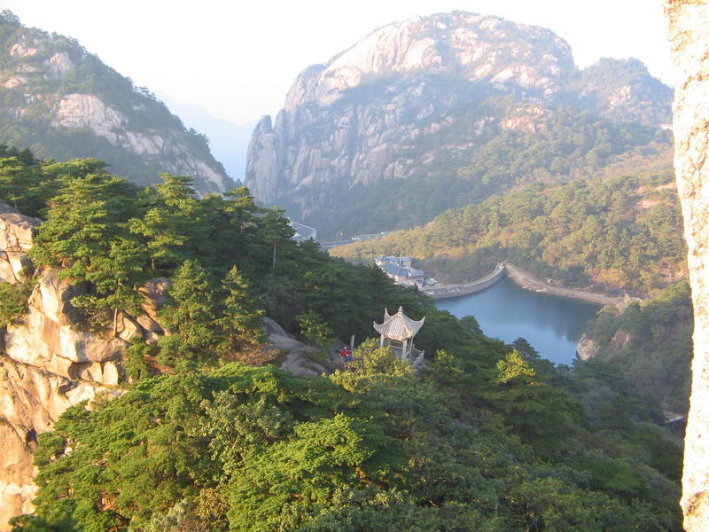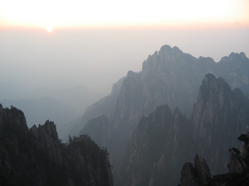 十、光明顶 下狮子峰,休息了一会儿,已是下午近3:00。接下来如何安排?商量了一下,我们定下的计划是先从北海上光明顶,看一下日出日落的时间,然后从飞来石方向下山,在飞来石处观日落,再从排云楼宾馆经西海返回北海住宿。 光明顶是黄山第二高峰,虽然在网上似乎评价并不太高,但作为一个知名的旅行社必去的地方,应该有其独到之处。抱着这一想法,我们踏上了“围攻”光明顶之旅。不知怎么的,提及光明顶,总是想到《倚天屠龙记》,想起张无忌、赵敏、周芷若。其实小说中光明顶远在昆仑山,应该在新疆一带,与这一光明顶显然并非一处。小卢倒是提到了光明左使―――杨逍。女孩子对于那些有才又有些张狂、有些霸道又不乏深情的成熟男人还是普遍缺乏免疫力的,如此看来,《倚天》中第一魅力型男非杨逍莫属,而并不是那个老实巴交、感情摇摆不定的张教主。 攀登光明顶之路一开始有些平淡,一路上穿行于树林之中,无法远观美景,只是在路边曾看到两只精灵---小松鼠 。这是我们第一次在野外看到松鼠,小卢兴奋不已,抓起相机一阵狂拍,毕竟是女孩子。这让我想到我那可爱的女儿,如果她在这儿,想必也是如此。路上见到来自北京的两位老人,都已经七十多岁了,两人携手相扶,虽甚艰难,却信心满满,令我辈心生敬意。小卢开始体力不支,但在不能让老人赶上来的信念支撑下,我们仍加快了进程。在已经可以看到光明顶那白色足球模样的建筑物时,右侧西部视野内出现了飞来石的身影,那是我们观日落的地点。而此时,通往光明顶的小路上一波接一波如潮水般地不断涌下旅行团的大队人马,我们少量自助游的人群难以逆流而上,不得已在路边休息等待大队人马过后再继续上行。终于听到头顶鼎沸的人声,光明顶到了。 山顶上叫卖声此起彼伏,游客众多,但未到人满为患的地步。其时正是下午4:00多钟的样子。向南看去,啊,网上无数次见到的莲花、天都双峰并列的壮观景色只有在光明顶上才可以如此清晰、一目了然的见到。目光所及还有对面鳌鱼峰上密集的人群。东行数十米,又有一小峰名曰炼丹峰,是光明顶的辅峰,轻易到得山顶。原来光明顶景观的精华就在这里。向下近看,幽谷森森,怪石林立;远看东方,则群山隐隐,天色如洗,天际间蓝色后面又透着淡淡的紫色霞光;南面天都、莲花的壮美身影近在迟尺,令人无限向往。耳边赞美之声不绝于耳,我们能做的只是用眼晴、用相机记录下这美丽的景色。 十、飞来石日落 找了一圈,终于在餐厅下面靠南面的墙上见到了传说中的显示屏。但等了一会儿,显示屏上并未显示出明日的日出概率以及日出日落时间,只是在一旁有几幅宣传画,宣传画上列示出全年不同月份的日出、日落时间。十月份日落时间约17:37分,日出时间约6:04分。这时已是下午4:40分,太阳还是很刺眼的样子,但日落也快了,赶紧向飞来石方向进发。 十五分钟左右即已来到飞来石下,又得排队,仅能一人通过的向上的小道,不过十米,有保安在一旁指挥,先下后上。登石而观,绝美的景色尽收眼前。西侧幽深的西海大峡谷中,奇峰林立,山峰上则奇石、怪松千姿百态,而东北侧,西海水库犹如一面镜子镶嵌在群山怀抱之中,在夕阳下熠熠发光。我记得红楼梦电视剧中,开头一段先是镜头在一片幽深奇美的山谷中扫视,最后再现出这块飞来石,那片山谷应该就是眼前的这西海峡谷。此外,中央电视台黄山的风景广告中,“感受黄山,天下无山”那句话出现时的画面也应该就是此处。这片峡谷显然是黄山的精华所在。日落时间就快到了,我们索性坐了下来,静待那最美好时光的到来。 太阳一点一点的落下,将远处的云朵染上了绯红的色彩,也将周边的群峰镀上一层神秘的光辉,一切美得让人心醉。耳边除了卡嚓的照相声,就是不绝于耳发至内心的赞叹之声。一位汉子说:谁能告诉我,还有什么地方比黄山更美的,知道的要告诉我,向我推荐啊。他说这话时是认真的。是啊,有诗云:曾经沧海难为水,除却巫山不是云。就我所曾去过的名山而言,除却人文因素外,光论风景,不管是庐山还是泰山、雁荡山等均是无法与之相比的,即使是同样以风景著称的华山与之相较也尚有一段距离。是啊,以后还有什么山能够强烈地吸引我前往一睹为快呢。我终于明白妻子那种对其他名山都不太向往的感受了。她过早地去过了黄山,我不知道是她的幸运还是不幸。老人们常说,好吃的东西要留到最后吃,这话放在观景方面也是恰当不过的了。太阳终于完全落了下去,失去太阳光辉映照的西海峡谷又如泼墨的山水画一般,呈现出淡青色如梦幻般的色彩。直到17:45分,天色已接近全黑,我们才恋恋不舍的离去。