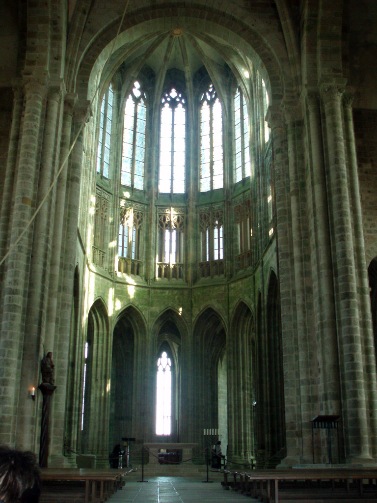 圣米歇尔山是一块在海中央周长约 圣米歇尔山上修道院的历史,源自于公元708年,阿弗朗区的主教根据上帝派来的天使圣米歇尔显灵的指示,在这个岩石上建了一个小教堂,之后这里便成了朝圣地。当时来这里朝圣的有穷人、有乞丐、有富人、有贵族甚至还有国王,人们上山要趁落潮涉水而过,为此还淹死过不少人。当时宗教的力量可见一斑。 现在的修道院从13世纪开始兴建,断断续续一直建到16世纪。以那时的技术,把那么多的大块花岗岩从几十公里甚至几百公里外搬到山上,工作的艰苦程度可想而知。 上山街道的路面铺着古老的花岗岩石块,两边的的房子也保留着中世纪的古老样子,当然现在全都用作了餐厅和旅游纪念品商店。已经是下午3点钟,我们早已饥肠辘辘。女儿提议试一下当地的特色食物,法文叫CREPE,中文大概可以译为鸡蛋摊饼。于是我们走上了一家在楼上的餐厅,餐厅不大,布置古色古香,坐下来感觉很放松。鸡蛋摊饼有咸有甜,咸的有放肉或干酪,甜的有糖或可可味道。胖胖的厨娘态度和善,老伴向她“偷师”的时候,女儿给他们俩留了个合照。 进入圣米歇尔山是不用收费的,但入山顶修道院则要8欧元一人。如此重要的历史遗迹,岂有不进之理。 山顶的修道院从1211年建到1228年,包括了东侧的施舍厅、迎客厅、和饭厅;西侧的骑士厅、食物储藏室和回廊。修道院的最高处建有四道长廊,227个红色花岗岩立柱。它的建筑风格结合了罗马式的简朴和哥特式的精雕细琢,合理安排交叉穹隆的拱顶,广泛地采用了跨梁拱的节点,被称为“神奇式作品”。