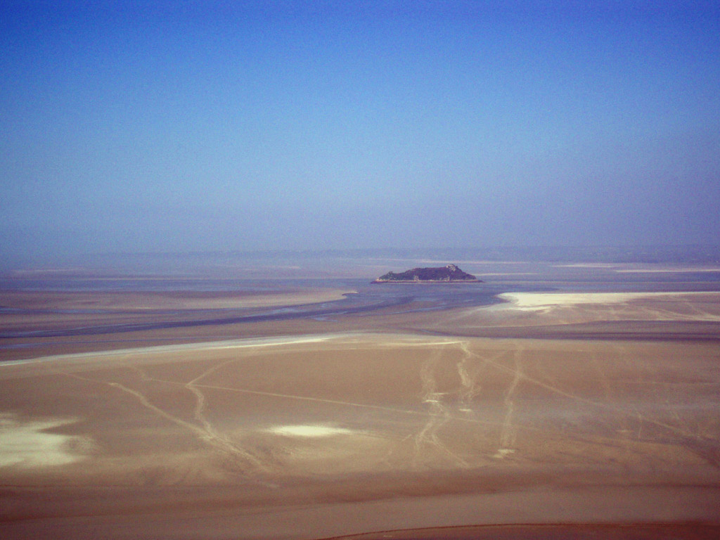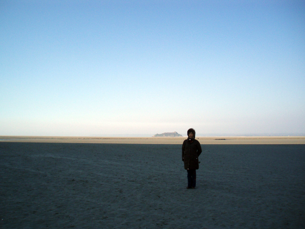 上次错过了去圣米歇尔山(MONT ST MICHEL)的火车,但我们对于这个有海上仙山之称、属于世界文化遗产之一的著名景点还是非常向往。 错误是不应该重犯的。早上准时到达火车站,9点05分开车,11点08分抵达雷恩(Rennes)车站 ,在那里转乘汽车。还没抵达圣米歇尔山,汽车沿途经过的就已经是风景了。公路两边的房子非常赏心悦目,全部是两层高红色瓦的房屋,屋顶很尖向两边斜得很厉害,上面顶着一两个圣诞老人投递礼物的烟囱。老伴说是不是法国北部冬天下雪,为了不积雪房顶才要建得那么斜呢?屋子外面是花园,花园里的草坪和树木修得整整齐齐、干干净净,有些花园里还垒着堆木柴——一派欧洲特有的田园风光。不过沿路都很少看见有人。 汽车在公路上奔跑着,慢慢地不见了房子,笔直的公路延伸到海的中央。海水已经退潮,公路两边是沙滩,远处是一望无际的大海。突然正前方出现一座被大海包围的小岛。远远看去岛上四周建有城墙,教堂的钟楼高高地耸立在山顶上,这时候真能体验到朝圣者来到这座宗教圣山前的感觉。