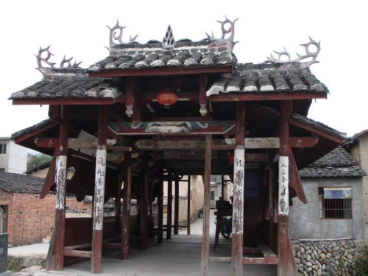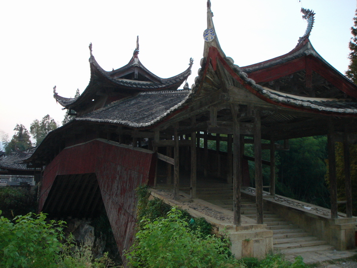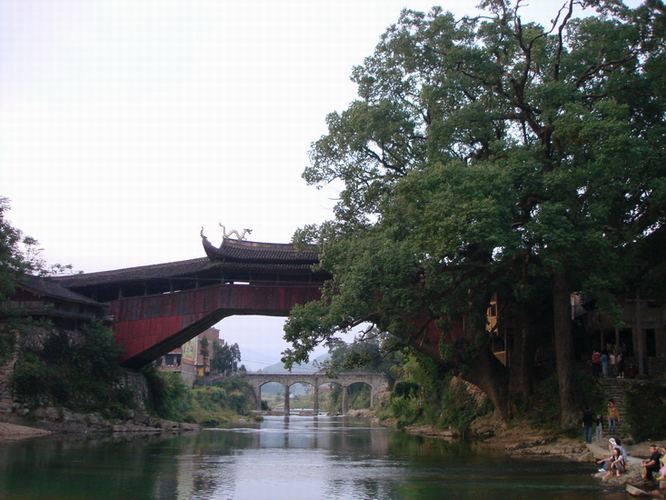 溪东桥是叠梁式木拱廊桥,溪东桥始建于明隆庆四年,桥由二层拱骨相贯而成梁架上建长廊式桥屋15间,中间三间高起为楼阁。