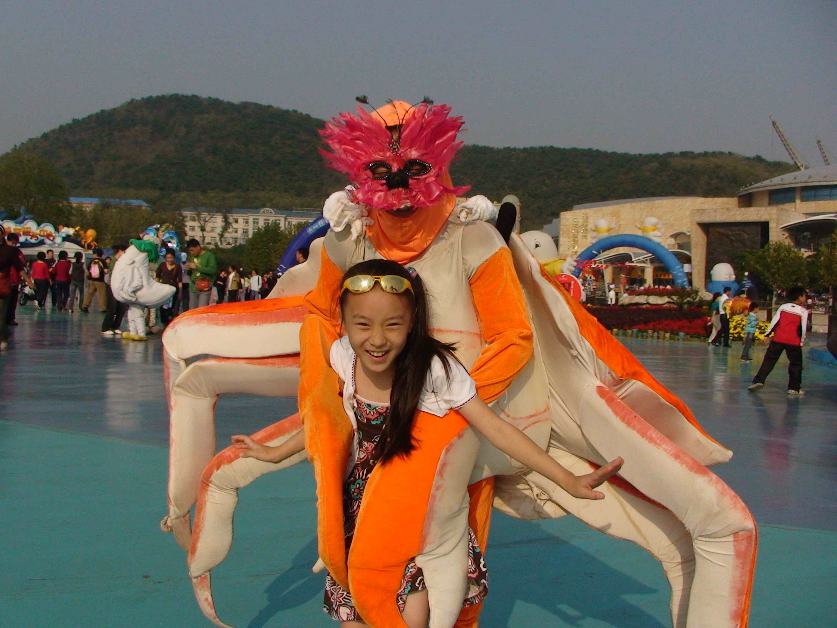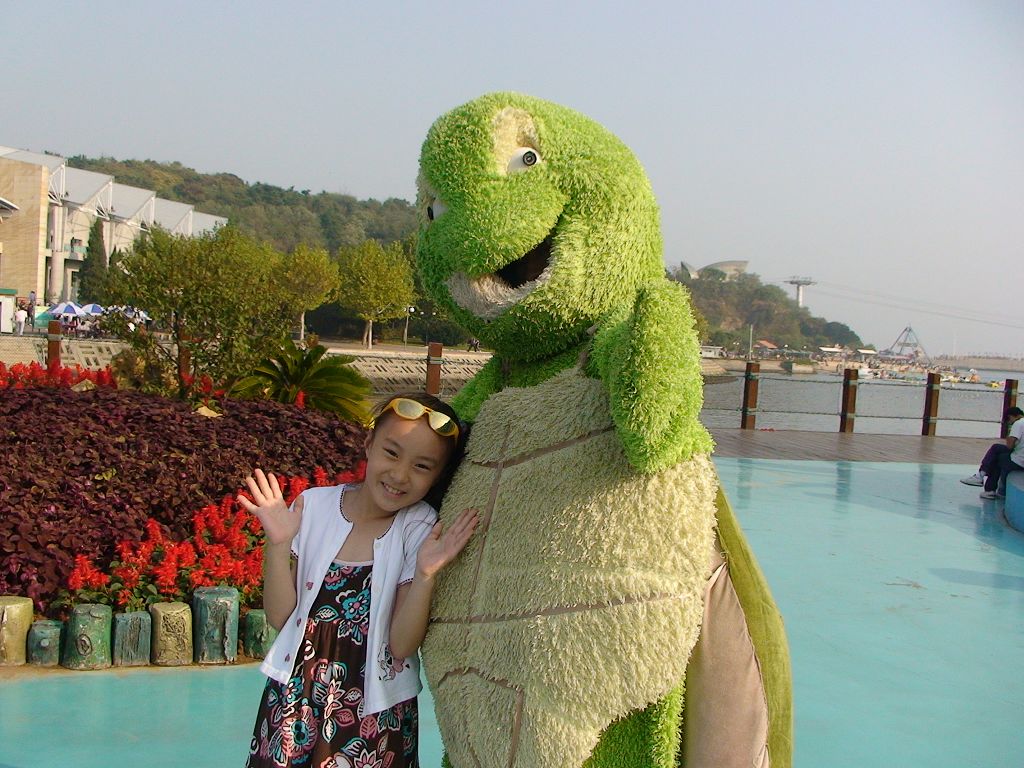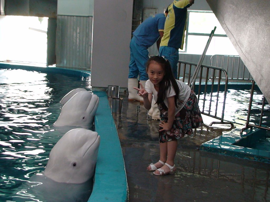 第二天(10月2日): 早晨在小鸟的欢快叫声中醒来,一看原来8点多啦!赶紧洗漱后用早餐,再上周围散散步!空气特别的清新,沁人心脾!9点半丁师傅准时来接我们,带着小美欣然出发啦. 今天的路线是海之韵广场__老虎滩海洋公园__北大桥__燕窝岭__星海广场,这可是偶综合许多网友的游记选定的精华哦!到海之韵公园内,一路哟扑很多海洋生物的造型,小美喜欢的不得了,不时爬上去拍照.还有怪坡,明明是下坡,可熄火后车却向后(高处)溜去!师傅给我们演示好几遍,小美开心的笑个不停!接着去老虎滩海洋公园,这可是最著名的旅游景地,孩子们的最爱!大门内有许多可爱的"动物",吸引着孩子们的目光,她们还不时和一些孩子合影,人气极旺哦!节日期间公园只卖套票,190元一张.好笑的是真正的游玩者却不需买票(小美1.3米以下免票),而我只是陪游者,却要买票!里面有极地动物馆,海兽馆,珊瑚馆,欢乐剧场,鸟语馆五大处.极地馆是最吸引人的,里面白鲸及海豚的表演非常精彩,连偶都开心雀跃的回到童年一样!表演结束,有六个名额可以坐海豚拉的小船游一圈,还可以和白鲸、海豚照相,小美吱溜一下就不见人影,后来才发现她排在第一位等着坐船呢!偶也忍不住报名和海豚合影去啦,还对拍照的帅哥小小放放电,让他多帮拍几张(必须由训练员照相).最后我和小美都满意而去,只是偶口袋里的250元就这么没啦——有点心痛哦!第二处是欢乐剧场,主要看海狮和海象表演。可爱的海狮也值得赞一个!海兽馆只是看看海狗海豹等,珊瑚馆匆匆而过,没多大意思。鸟语林没去,一来较远,据说没什么看的,二来赶时间(丁师傅是白班司机,4点要交接班的),三点钟就出园了。接着就沿滨海路(最佳观光路)往北大桥而去。一路可见不少游人步行,可对于一般游客,还是建议坐车前往,否则太辛苦!北大桥也称情人桥,桥下可见风车,大海,很有一番异国风味,遇到不少拍婚纱照的,还有一对中老年朋友呢——真是让人羡慕和感动啊,如此年龄还能够执子之手!小美搔首弄姿一番后,继续前行,最后再次来到星海广场。白天的广场没有夜晚的妩媚多姿,而是一种大气,很宽阔!从广场中央大道中心点往北500米是会展中心;往南是百年城雕广场,500米外是蓝色的大海。中央大道红砖铺地,两侧绿草如茵,每隔20米设一个航标灯造型的石柱灯,象征着中国正面向大海,走向世界。小美见到广场中的游乐场,眼睛发亮啊,把每种游戏都玩了个遍。偶也按捺不住,跟着小美去享受了一把!最恐怖的是什么“韩国的士高”,坐在象大饼似的圆盘上,一会颠,一会摇,一会甩的,紧张的偶是嗷嗷叫,手都磨出血啦,一趟停下就赶紧逃啦!可俺家小美,坐了4遍还不肯下来,最后连蹦极也玩上啦!偶滴天啊,真是青出于兰啊!最享受的是一种可以转圈的椅子啦(不记得是什么啦),上面有铁链系于一园盘上,开动后逐渐甩高(离心力吧),最后高高荡起,可以看见前面的大海,波光粼粼,让人心旷神怡!偶感觉一下子回到了童年,和小美一起在广场奔跑嬉戏着......一直到累极啦,才到旁边的“现代粗粮”(网上推荐的)去品尝海鲜及各种粗粮,饱餐一顿啦。(待续)