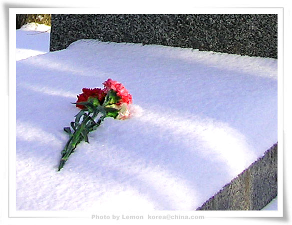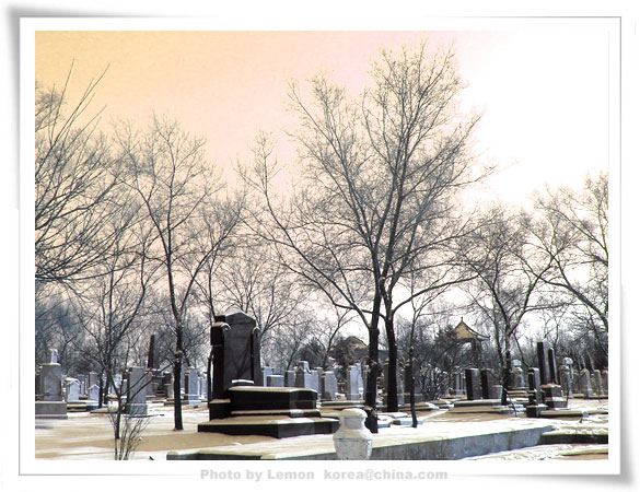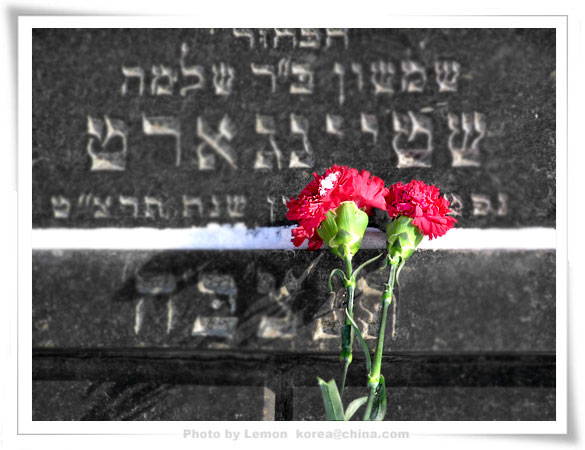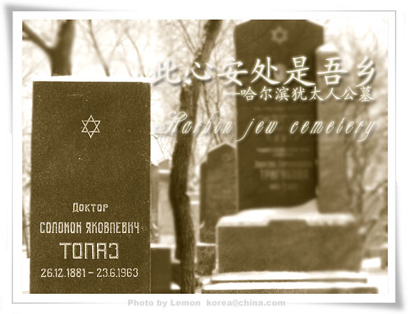 圣诞节后刚刚下过一场大雪,我们从先锋路口驱车驶上哈同公路,行驶几公里,便到达了皇山公墓。犹太公墓位于中国人墓地的北侧,东侧为规模较小的俄国人墓地,一处犹太建筑风格的大门连接着由葡萄藤搭成的甬道,甬道两侧就是600余个保存完好的大理石、花岗岩墓碑。白雪覆盖了这片沉静的土地,也覆盖着这块土地下无声的灵魂,阳光与树木石碑交织的光影,勾画着他们的传奇。墓碑的造型各异,有的像一本翻开的书,记录着死者一生的历程;有的像一棵树干象征着生命的终结;有的好似覆盖一个紧扎的头巾,似乎在述说一个人生故事的结束;有的镶嵌着橄榄叶,仿佛在向世界祈祷和平,又好像在讲述着一个个引人入胜的圣经故事。这些墓碑形式不拘一格,各有千秋,体现了犹太民族蕴藏深邃的文化特色。这里安葬着以色列前总理拉宾的亲属,哈尔滨犹太人的精神领袖亚伦· 吉塞列夫以及当年哈尔滨犹太宗教公会会长亚·考夫曼的亲属们。这些写着列文、考夫曼、奥尔梅特等犹太人名字的墓碑和不远处成百上千的中国人墓碑静静地比邻安息。