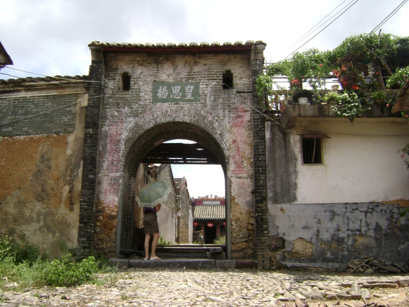 (乡镇公路) 到稔山时,已是中午时分。南国盛夏的正午,骄阳似火,炎热难当。以前看水浒传,里面有一篇是描写“智取生辰纲”的,白胜所哼唱的一首小诗经常被人们用来形容夏季的酷热,记得诗歌是这样的:赤日炎炎似火烧,野田禾稻半枯焦。农夫心内如汤煮,公子王孙把扇摇。非常形象地描述了盛夏的酷热天气和不同阶层民众在此境况下的不同际遇和心态。现在,时代已变迁,虽然是一样的炎热,田野里的禾苗却依然是一片葱绿,对现在的农民而言干旱已不再是不可克服的农业难题。在这样的季节,我们的农夫们也可以坐在屋檐树丛中,悠闲的摇扇纳凉。“赤日炎炎似火烧”正是这是惠州炎热气温的准确写照,将车内的空调开到最大,呼呼的凉风才使人感觉舒适一些。 离开惠东二十余里,偶然间看到路牌指示前面不远处有一个旅游景点,叫皇思扬村。乍一听,觉得这名字有点怪,总觉得和京城里的皇帝有点牵挂,却始终未能弄明白其含义。顺着路牌的指示,将车子开进村里。