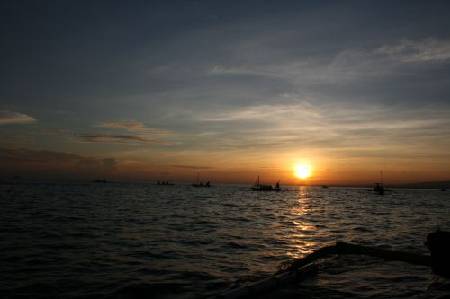 Lovina --- Kuta: 一早就被隔壁“鬼佬”的“鬼叫”给吵醒了。开灯看表,五点半。收拾好出门,昨天约好的船夫早已在门外等候。他先用摩托车载我到海边,让我在他的船旁边等着,然后去接另外两个人来。 此时天还没亮,四处一片寂静。远处海滩上的点点渔火点缀着黎明前的沉默。海水寂静无声,缓缓地一层层漫上来,温柔得仿佛一匹黑色的冰丝绸缎,柔和得让人忍不住想要抚摸它。 马达的声音划破黎明的寂静。天边开始破晓,渐渐出现万丈朝霞。海水依然温柔地荡漾着,忍不住用手触摸,海水是微温的,且没什么腥味。 船走了约20分钟,远远的看见前面的小船的船头,似有点点的黑影,应该就是海豚了。海豚群的出没非常没有规律,通常是在某一处出现,十几艘船就开足马达奔赴前往。不由想起Rough Guide上说的,通常你拍出来的照片,分分钟船还多过海豚。最近的一次,海豚们在离我三 回去时,船在离岸约两百米处忽然停下来慢慢前行。正不知为何之间,同船的女生让我看海底,才发现原来这约四、 告别Lovina,一路无话,回到了Kuta。 相比于Lovina,Kuta仿佛是另一个人间。 灯光和点点烛光交织成密密的网,朦胧地罩着这片天地。衣香鬓影,笑靥如花,轻笑低语。空气中隐隐约约的香气,不遗余力地制造出浪漫的气息。 坐在房间走廊的栏杆上,看着这片不夜的乐土。浮生若梦。忽然想起安妮的这段话:“在路途上想起爱情来,觉得最好的爱情是两个人彼此做个伴。不要束缚,不要缠绕,不要占有。不要渴望从对方的身上挖掘到意义,那是注定要落空的东西,而应该是,我们两个人,并排站在一起,看看这个落寞的人间。” 一瞬间,喧哗声似乎被阻隔在另一个空间,遥远几不可闻,只有夜风仍在耳边低低唱着。 这温柔的夜。