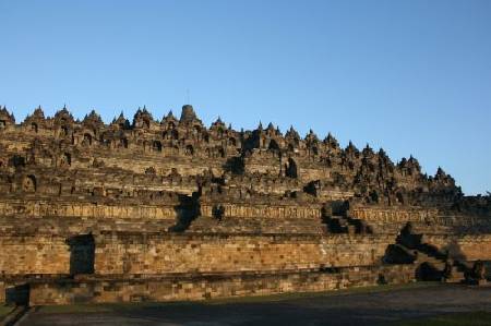 日惹: 因为不太熟悉日惹,所以参加了一日团去参观婆罗浮屠和普兰班南寺。 清晨五点钟出发。到达婆罗浮屠时,天已经亮起来。可惜不能在婆罗浮屠看到日出,因为婆罗浮屠太低了。 婆罗浮屠(Borobudur)坐落于日惹西北方约 在我小学的时候,曾经在一本《飞碟探索》之类的杂志上看过婆罗浮屠的介绍。直到现在,还很深刻地记得,杂志上土黄色的浮壁,异常美丽,仿若一场华丽的黄粱梦,引导着教徒前往佛教极致的无忧乐土。 婆罗浮屠共有十层。无论哪一层的浮雕,佛像都是宁静的沉默或粘花微笑。即便是欲望世界里,人们总是宁静的沉默或微笑。或者即便浮世如斯之苦,有了信仰的指引,总能找到心灵上的一片乐土。 接着去普兰班南寺(Prambanan)。Prambanan 因为前两年遭遇了地震,所以被封起来维修,只能在外面观看。Prambanan的建筑风格倒是比较接近吴哥的。 婆罗浮屠和普兰班南寺对当地人的门票是很便宜,只要一万印币,而外国人的贵了差不多十倍。所以,我们在参观婆罗浮屠和普兰班南寺时遇到很多当地人,还有一些像是当地中小学校组织的旅行团。也许因为日惹比较少游客,身为外国人的我们自然显得很稀有。于是我们都一一被小女生们邀请合照。实在很可爱。我们都说,We come here to take the photo with the temple, but they come here to take the photo with us。