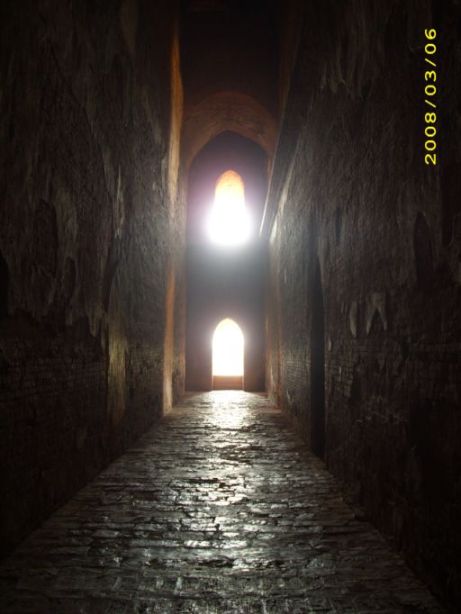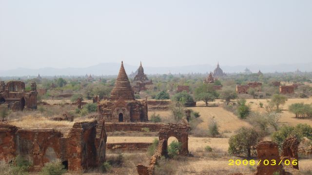 三月四日:初见 早上起来很痛快地洗刷一番。吃过午饭,找了辆马车,就向万塔之国蒲甘出发了。 马车从大道转入小路不久,便惊喜地发现草丛中不时有砖红色的佛塔。然而马车却丝毫没有停下来的意思。想想也是,在约25平方公里的土地上,散落着大大小小的佛塔多达2000多座,这些小佛塔也许真的不值一提。据说在鼎盛时期,蒲甘的佛塔多达四百多万座。只是经历了上千年的风雨洗礼以及战火天灾,许多佛塔已经成为历史。 车夫带我们看了一系列他们认为值得看的Temple。大多是金顶闪闪的佛塔,里面供奉着金光闪闪的佛像。也许在缅甸人眼里,重要的是朝拜神佛,而不是佛塔;而我们千里迢迢来到这里,为的是佛塔而不是里面的满天神佛。究竟是缅甸人更明白精神信仰比浮华的外表更重要还是我们这些吹捧唯物主义的人更能洞悉世情,获得可贵的自由?This is a question。 第一天的日落是在车夫推荐的一个不知名的佛塔上看的。极目瞭望,星罗棋布的暗红色的佛塔一直延绵到天边。夕阳温柔地为佛塔披上一件橘黄色的外衣,似乎散发着一层光晕。回想起一年前,我看着网上的照片,神往不已。一年后,我就真的在这里了,那令我神往不已的情景,就这样毫无保留地展现在我眼前。 晚餐是在距离良乌镇颇远的Eden BBB吃的。这家饭店的环境很不错,当然价格也很不错。不过折合人民币,也只是在中国一个稍微好点的饭店的消费水平。整个晚上包括我们在内只有两桌客人。中间有简单的木偶戏,不过没什么看头。吃完饭,我们决定散步回去,想说反正有路灯。没想才走了一会,路灯忽地全熄灭了。霎那间四下里漆黑一片,寂静无人。我们不知所措,本想向饭店借个手电筒什么的,然而饭店也没有。无奈之下,惟有摸黑前进。凡事有一失必有一得,也许因为周围环境实在太黑,越发显得天上的星星明亮非常。许久没见过这么明亮的星星,真的十分怀念。 踏着这样的星光,我们愉快地回到了GH。