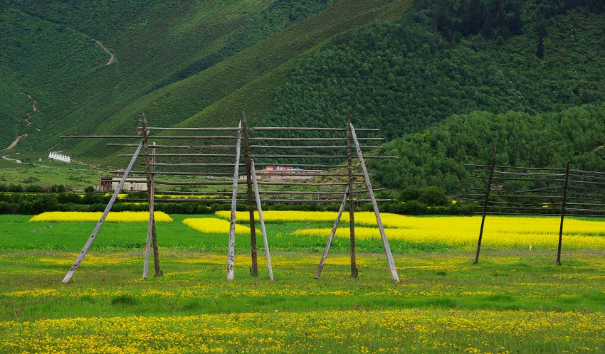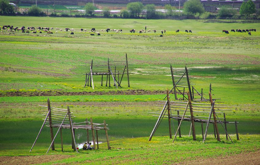 草原上的青稞架,据说这是晒草和青稞用的,用来给牲口贮备过冬用的粮草!