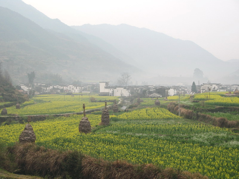 3月19号7:00晨起后去村子四周走了一圈,清晨的庆源空气真的很好,只是今天好象感觉要下雨所以多了一点闷热的感觉,后来比较了才发现庆源和县城至少温度相差有5度。照了些照片后,相机显示电量不足了,好不容易借到了佳能的充电器给了些养,我们等到10:00多终于出发了,今天的行程是去江岭、晓起、彩虹桥、理坑(从东线过渡到北线)。一路上路牌显示十分清晰,路过江岭就下车拍了些照,因为此时油菜花还未到开得最佳的时节而且一行中的人中并未有人响应,所以我只好放弃去江岭的计划(后来才明白同行的人不想出这门票的钱,郁闷!)。晓起村昨天经过,所以很快就到了晓起的停车场停下,收费5元。