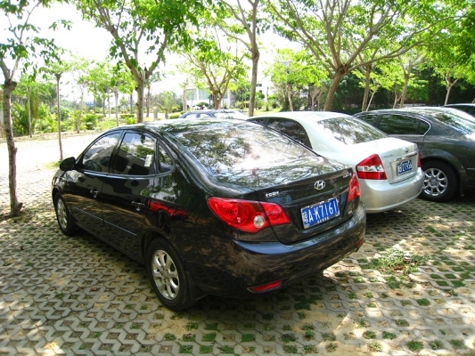 出发啦, 早上6:30分准点出门. 交通衔接很顺利, 8:30 分到上海火车站, 出站走出 浦东机场新建成的2号候机楼应该是国内目前最漂亮的, 豪华而不张扬,敞亮而不喧嚣,有序而不生硬.边上角落有一个餐馆,大幅的标价显示面食从12元-25元之间,价格还算是公道,心里想着这是肯德鸡在入驻机场之后做的唯一有利于中国市场的一件好事。 南航的办票柜台在最里侧的J岛, 南航工作人员麻利办好登机牌. 长久以来,每个月都要有2次以上的往返程旅行,也去了很多地方,已经很长时间没有在其他机场遇到过这样训练有素的好服务了,包括虹桥机场和北京首都机场。很是疑惑服务态度和环境是否有关? 那首都机场不也是很好的设施么? 是不是北京人习惯了沙尘暴和肃杀的寒秋,对所有人都像秋风扫落叶一般?看来,内部小环境,外部大环境对服务的影响还是很大的。 儿子到了机场之后一直很兴奋,不停地问什么时候上飞机,我说1个多小时,但是他还是执著的问着。6岁的小童对时间还是没有概念。我带他到候机厅最边上,隔着落地大窗,指着很远的飞机说那就是我们待会儿要坐的飞机,并逗他:“爸爸把这个飞机买回去,天天开飞机上班好不好?” 儿子毫不思索的回答:“飞机是用来开的,不是用来买的”。人小鬼大,给了我一个脑筋急转弯的答案。 终于上飞机了,座位前后的是浙江的一个大妈大嫂旅游团,起飞前机舱里那个热闹,料想这一航程要伴着千只鸭子飞翔了。不过起飞后情况还是大出所料,大嫂们并没有天南海北,家长里短的狂侃,还算安静。 飞机在轰鸣声中爬升,在云端之上平稳后,儿子焦急的嚷嚷,我要吃飞机上的快餐,怎么还不来?我们一家人这时恍然大悟为啥小家伙一早就要急急地上飞机,原来是惦记飞机上的盒饭了!等到乘务员发放了,小家伙吃了2份,米饭加水饺,认认真真吃完之后感慨万分“真好吃”,我们难以下咽的东西他尽然会吃的这么香!看来孩子自有对这个世界的评判标准,以后在孩子的教育中可要当心的。 3小时的飞行总算在煎熬中结束,换好衣服出来,海汽自驾的工作人员已经在接机了,带我们到美兰海航酒店提车交接都顺利,只是没想到一年不到的伊兰特悦动已经开了39500多公里了,心里凉了半截。不过也不好说什么,定车的时候海汽工作人员说了这辆车的行驶里程是3万左右。验车,签协议,刷卡5000押金,交现金1000作违章押金之后,点火发动上路。果不出所料,发动机在高速时的轰鸣声尽然把我按下的喇叭声都能盖住,后座避震也不如新车。车内空间还是很宽敞的,当时主要看中了这个,没有要另一辆同价但里程1万的飞度。 (租到的伊兰特悦动)