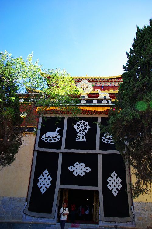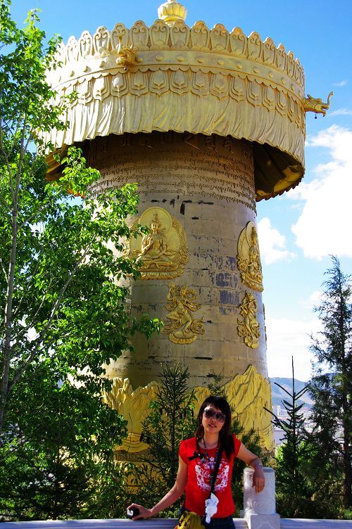 | 蓝天下的转经筒金光灿烂,为佛家重宝,转经筒,高 21米,总重60吨,需要身强体壮的多人一起推才能转得动,据说是世界上最大最重的镏金纯铜转经筒,载入了吉尼斯纪录。筒壁上雕有文殊,普贤,观音,地藏四大菩萨。 下层为佛家八宝:法--螺、法-- 轮、宝--伞、百--盖、莲--花、宝--瓶、金--鱼、盘--长。筒内藏有经文,六字真言124万条和多种佛宝。筒顶为比筒身直径明显大的圆形“伞盖”,轮座为巨大的滚珠轴承,金碧辉煌。