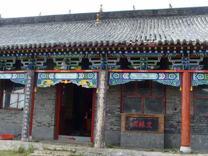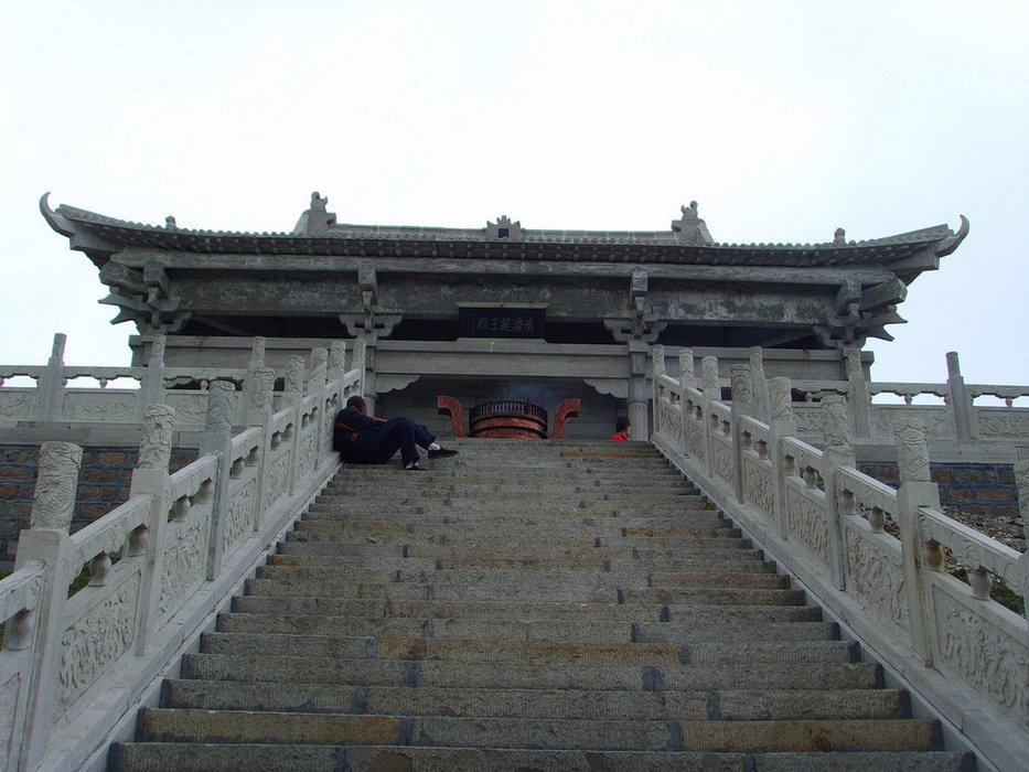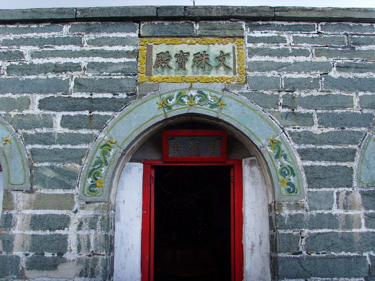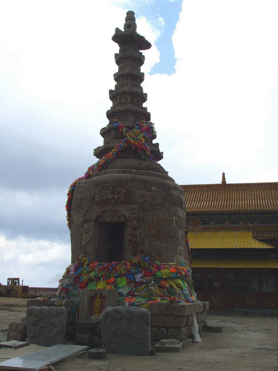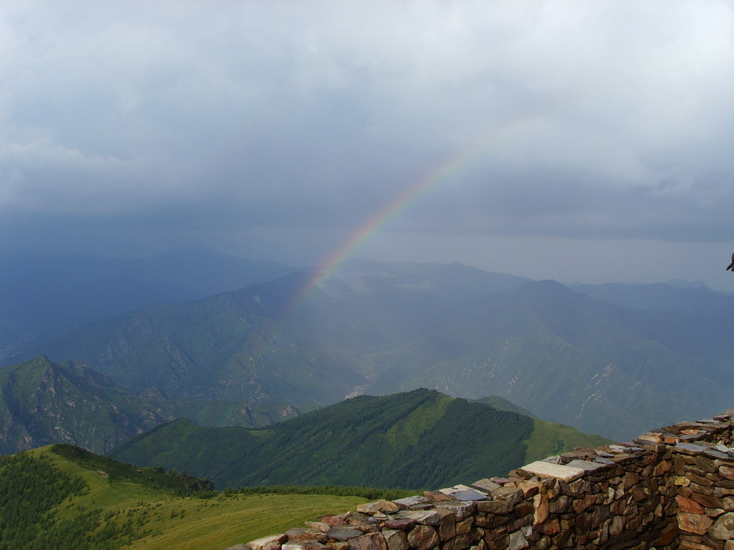 先到东台顶,亦名望海峰,据说天气晴好时能望见渤海,但那天是阴天,十一点多仍觉得台顶冷风飕飕。这里建有望海寺,供奉着聪明文殊像。望海寺目前建筑比较简陋,文殊殿居然是平顶的砖房(有点特别),大殿似乎尚未建成,但仍吸引很多的僧俗来此登山朝日。这里还有一尊巨大的卧佛,我去的时候露天安放着,不知将来是否会专门为其建殿。 东台和北台在一个方向,道路也是最好的,尤其是去北台的路几乎就是国道公路了,才一刻钟就到北台了,途中会经过标志着华北屋脊的石牌坊,北台海拔3058米,是五台山诸峰中的最高峰,也是华北地区的最高点。北台顶上建有灵应寺,灵应寺最初创建于隋代,历代多次重修,内供无垢文殊菩萨。灵应寺边是广济龙王庙,香火更旺,总觉得五台这边龙王庙挺多的,镇里的万佛阁供奉的五爷就是龙王,不知道有什么传说。2001年起北台新建的文殊殿和龙王殿均为汉白玉石砌筑。 下北台后先返回台怀镇,然后向中台行进。中台顶比较平坦,草丛中露出累累巨石,即所谓的“龙翻石”。从这里可以看到云雾下的黛螺顶。中台演教寺红墙黄瓦,里面供奉着孺童文殊,大雄宝殿前还有一座颇有年代的藏式佛塔。因为天气越来越阴暗,司机担心天气变坏的话可能走不完全程,在他的催促下我们没有久留就朝着下一个目标去了,不过司机倒是磨刀不误砍柴功,顺带稍了一位朝山的人,多收入车资100元(这个价格供大家参考)。 中台和西台离得也不远,途中时时看到当地人放养在山坡上的牛马,还有白牦牛呢,这让寂静的山路变得有了生气。当看见一坐挂满彩色经幡的白塔时,就到了西台顶挂月峰。台顶有座石砌的法雷寺,供狮子文殊,寺中央还有个不小的水池,山顶有水池可不容易啊。正好那天有法事,信徒来了不少,他们都是从台怀镇徒步上来的,有人还是磕等身头上来的,真佩服他们!法雷寺庙规模虽小,距其不远处却有个提供住宿的场所,规模很大(也是个寺庙?),西台是五台中住宿条件最好的地方了。 最后一站南台锦绣峰和前面四个台不在一条线上,经过狮子窝(有座辉煌的高塔,尽管开始下雨司机还是让我们下去转了一圈)和金阁寺后,从风景区西门出去(须登记)走上一条土道。这段路是最差的了,只修了个样子,颠簸起来和“疯狂的老鼠”有得一比,不过当地司机还是让我比较放心滴。8月底已经是夏末了,观山花的南台上只剩下少许的紫色小花点缀在绿色的草坪上,但这已让我觉得很满足了,一边和司机闲聊、一边有一搭没一搭地听着信徒和佛门弟子关于佛法的讨论。谁知过了半山腰后雨越下越猛,最后居然下冰雹了!从来不知道冰雹可以密集成暴雨的样子,打在车身上辟啪作响,眼前一片灰暗迷朦,下面则是崎岖且泥泞的山路,感觉我们是在枪林弹雨中前进。花是看不见了也没心思看了,讨论声没有了,大家都安静下来,司机默不作声缓缓地向前开着车,没人提出停车或返回,其实山路狭窄根本无法掉转车头,何况回去的路一样看不清。慢吞吞地我们居然在那场冰雹中蹭到了南台顶的普济寺前,我一直在琢磨是否这条路司机已经熟到闭着眼也能开到山顶呢?! 松了一口气,至少山顶上比较开阔安全。当车停稳后,让我们惊讶的是冰雹居然说停就停,蓝天白云此刻似乎触手可得,如果不是地上铺了一层似雪的冰雹简直让人以为刚刚是否做了一场恶梦,菩萨不会用这种方式来考验我们吧?顺手抓了一把冰雹,好家伙,每颗就象水果羹里的大西米那么大。进入寺内信步走到一个平台上竟看见了彩虹,真是意外的惊喜啊!巨大的七彩虹桥在山谷中横空出世,背景是起伏的翠绿群山,我震撼于大自然的奇妙威力,身边的佛门弟子更是口呼“佛光”感激菩萨的恩赐。几分钟后彩虹消失了,我们才开始参观寺庙。可能是为了抵御山顶的大风和寒冷,台顶的建筑几乎都以砖石为主,普济寺中有的建筑屋顶还用一层层薄石板铺就,有点类似南方少数民族的民居。普济寺里供奉的是智慧文殊,该寺在五个台顶寺庙中属于布局最完整的,地方虽不大,但各个殿基本都已落成了。寺庙的平台处是个看风光的好地方,在山腰上所见的紫色小花在这里平坦的山坡上也零星地开着,只是现在夹杂着很多白色的冰雹颗粒。 因为是最后一站而且天气转晴,大家就多逗留了一会儿才下山。下山很顺里,6点多就回到了人间台怀镇,镇上的人告诉我人间今天没下过雨。