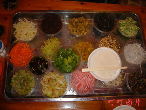 (丝娃娃)用皮把这些菜都包在里面然后蘸醋吃。因面皮包好菜丝时的形状酷似襁褓中的婴儿,故名。菜是可以随便加的,我比较钟爱黄瓜和香菜,每人6元,但是面皮吃完了是要再买的。估计这个怎么吃也吃不饱。