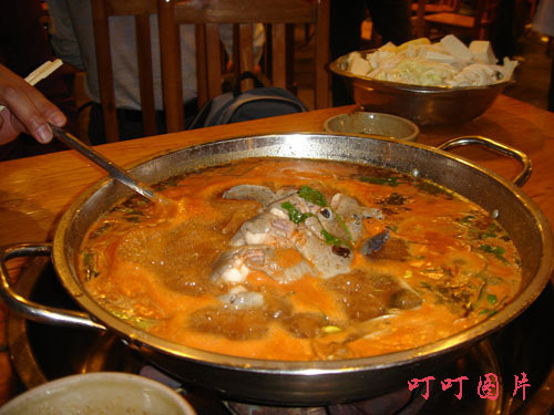 (老凯里的酸汤鱼)我要的是乌江鱼,38元一斤,其实也很贵。不过超级好吃,味道很特别,有木姜子油的味道(福建的叫姜子根),特香。这里还闹了一个笑话,服务员把这鱼端上来的时候,汤不是红色的。按照我在上海吃干锅居的经验,这鱼汤应该是红色的。我还把服务员叫来问是不是上错了,晕,后来才知道这汤是越煮越红,也才知道原来干锅居吃的不正宗。很奇怪,干锅居打的是贵州菜的招牌,主打是干锅,可我在贵阳似乎并没有发现什么干锅,还有重庆鸡公煲,打着重庆的牌子,可是我在重庆四天里就没看见“鸡公煲”这三个字。